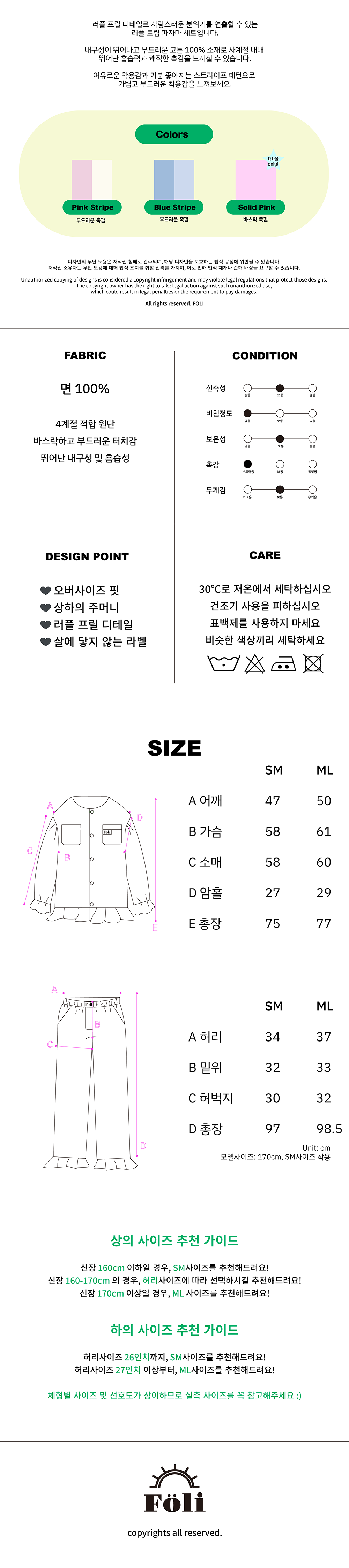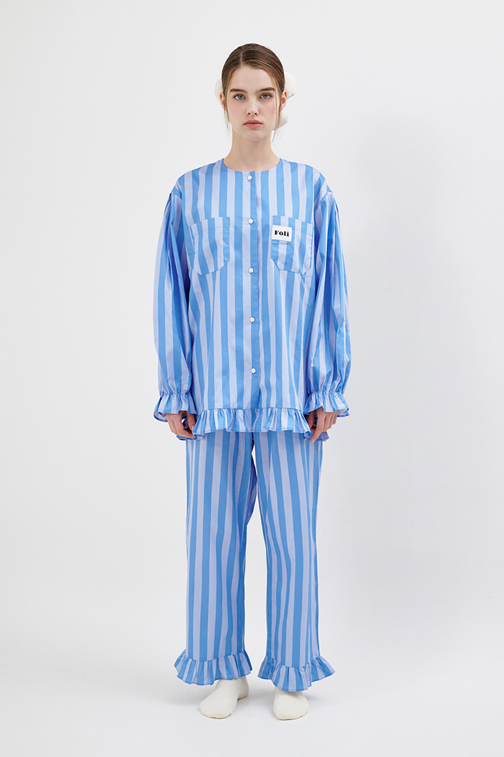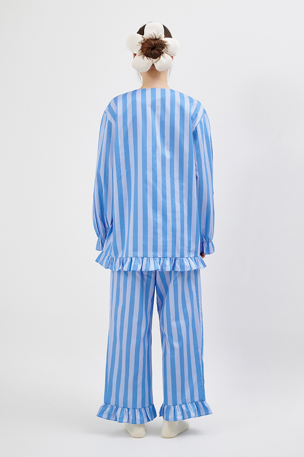 폴리 우먼 러플 트림 파자마 세트 블루 스트라이프