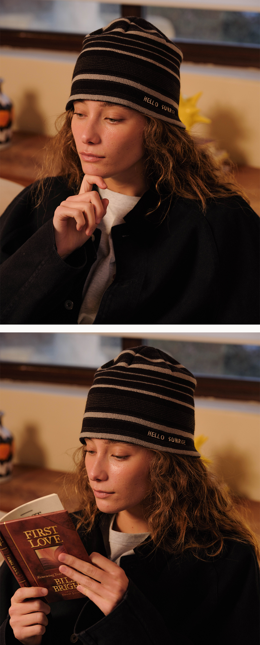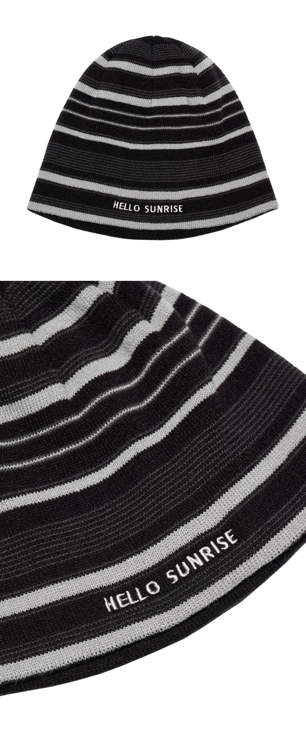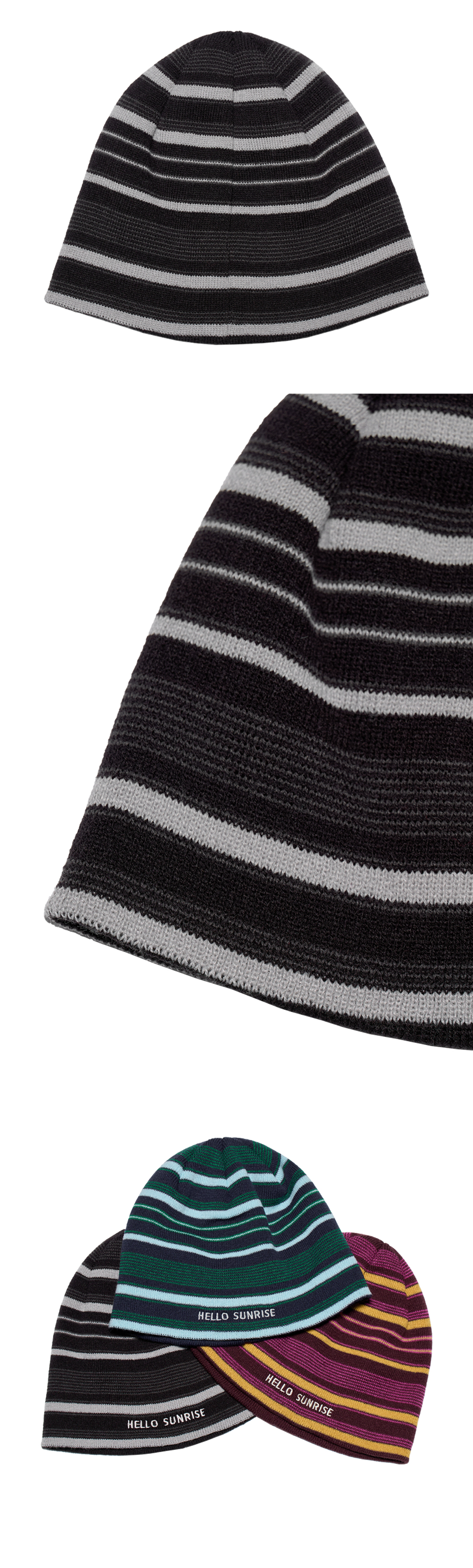 헬로선라이즈 타이포 그래픽이 자수로 들어간 스트라이프 비니입니다. - 직접 개발한 스트라이프 패턴 사용으로 포인트 - 앞판 HELLO SUNRISE 타이포 자수 처리 * 개인적인 취향에 따라 원하시는 방향으로 착용하시길 권장 드립니다. * 니트 재질 특성상 1-2cm의 차이가 있을 수 있습니다. * Acrylic 100% Made in Korea