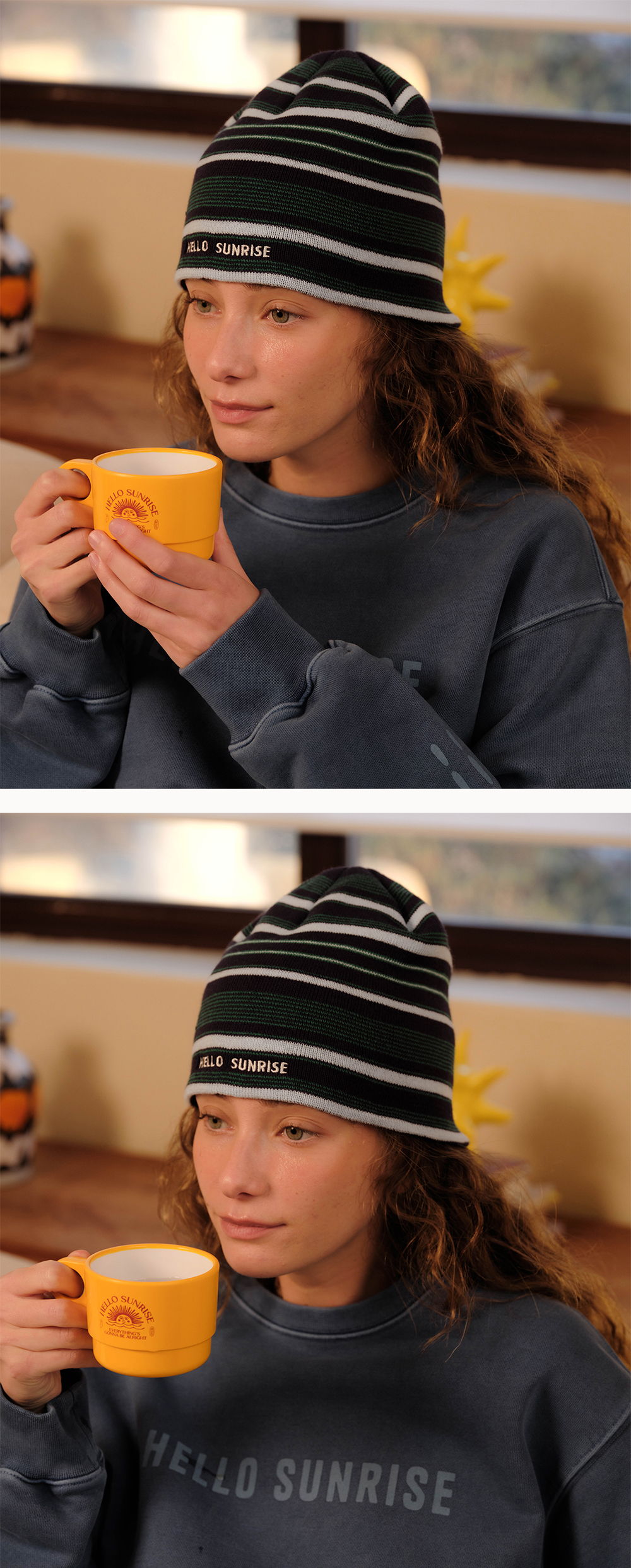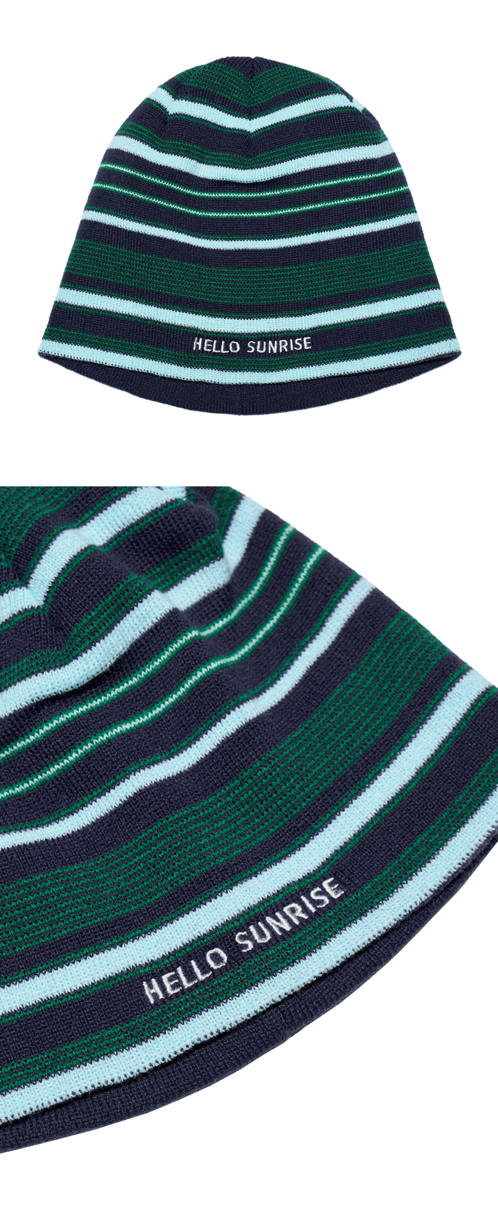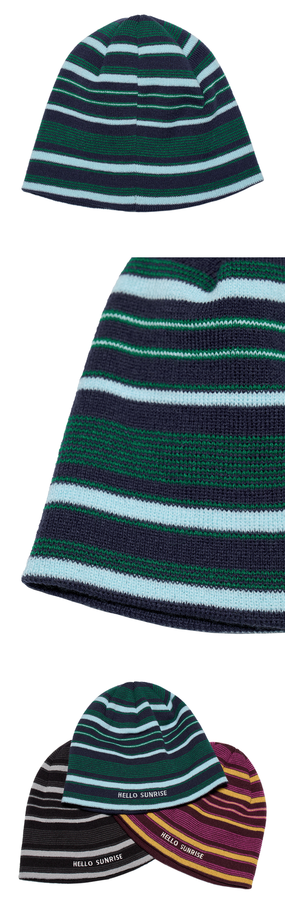헬로선라이즈 타이포 그래픽이 자수로 들어간 스트라이프 비니입니다. - 직접 개발한 스트라이프 패턴 사용으로 포인트 - 앞판 HELLO SUNRISE 타이포 자수 처리 * 개인적인 취향에 따라 원하시는 방향으로 착용하시길 권장 드립니다. * 니트 재질 특성상 1-2cm의 차이가 있을 수 있습니다. * Acrylic 100% Made in Korea