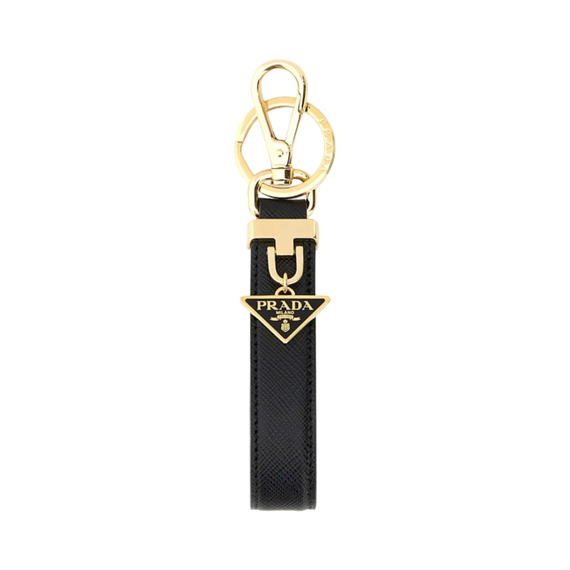 프라다 에나멜 메탈 트라이앵글 사피아노 레더 로고 키체인 블랙