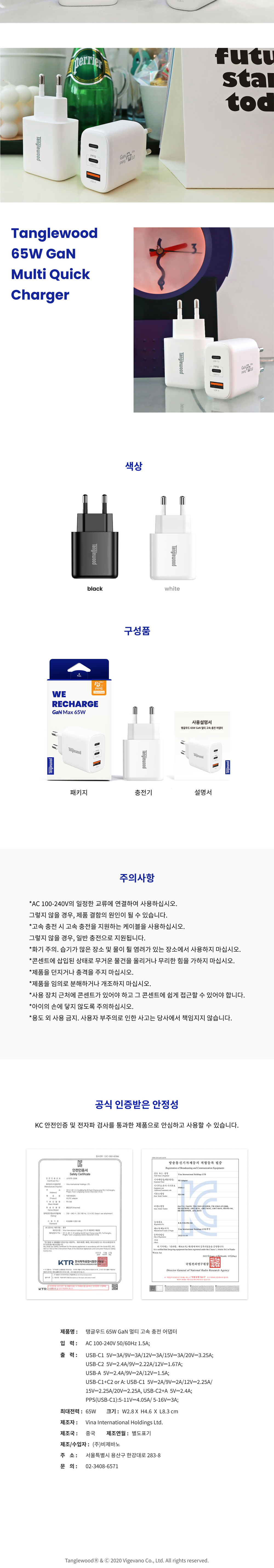 탱글우드 65W GaN 멀티 고속 충전 어댑터 화이트