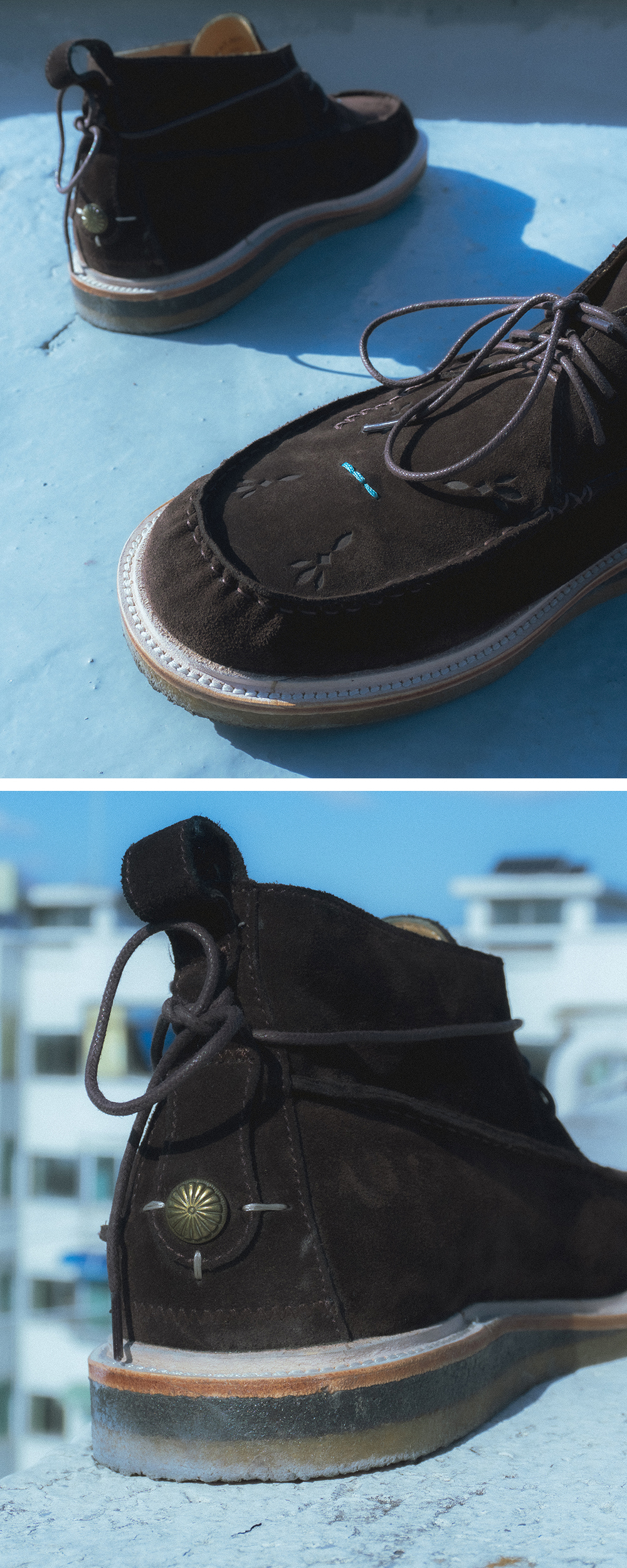 Product Info. - ROMANTIC MOVE 협업 제품 - 네이티브 모카신을 모티브로 재해석한 디자인 - 고품질 천연 송아지 가죽, 카프 스프리트 사용 - 텍스처 표면 실키 가공을 통한 소프트하고 내추럴한 터치감 - 수작업으로 주름을 잡아낸 슈즈 토 셔링 디테일 - 전면 터키석 모티브의 핸드 스티치 포인트 - 전면 웨스턴 무드의 패턴 프레스 디테일 - 후면 웨스턴 무드의 콘초 장식 디테일 - 갑피 연결부 전체 정통 핸드 스티치 공법 디테일 - 천연고무나무에서 추출한 원료를 쌓아 제작된 컬러 블럭 아웃솔 - 발이 닿는 내피와 인솔 모두 프리미엄 천연 소가죽 사용 - 사이드 웰트에 베지터블 내추럴 소가죽을 사용하여, 사용자의 생활 환경과 시간이 지남에 따라 경년변화가 나타나는 아이템