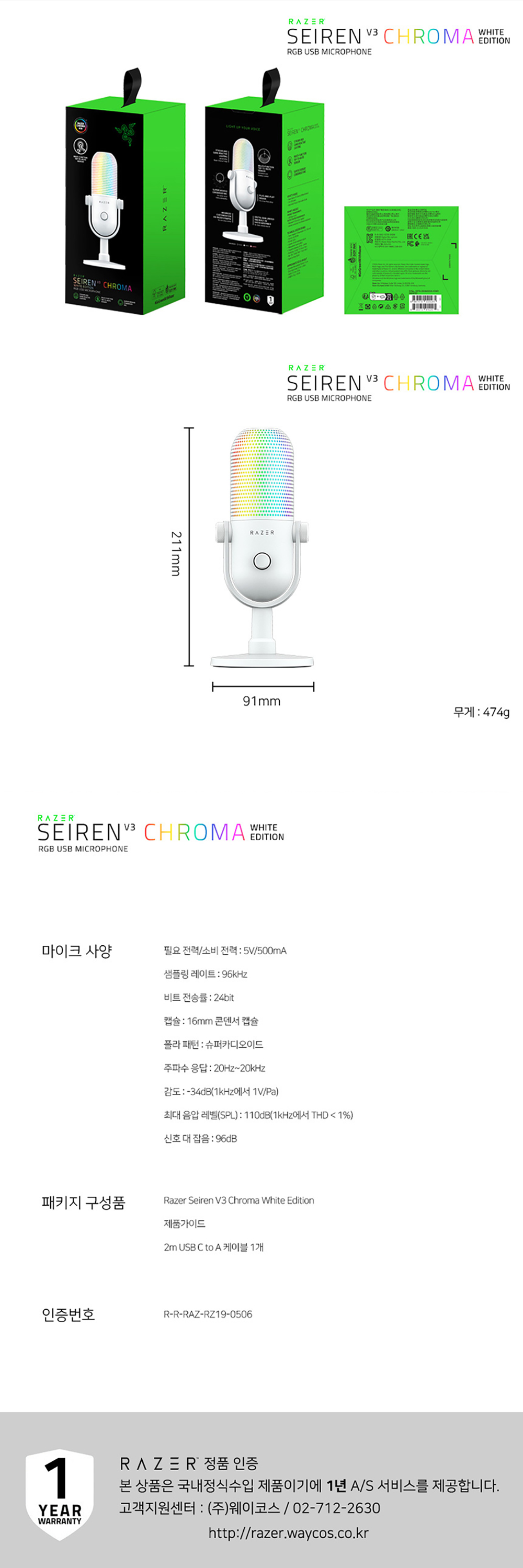 레이저 세이렌 V3 미니 화이트 Razer Seiren V3 Mini White 유선 스트리밍 USB 마이크