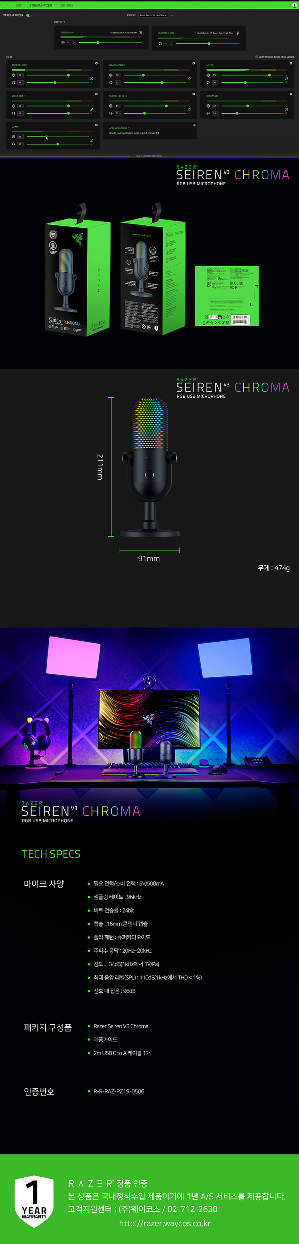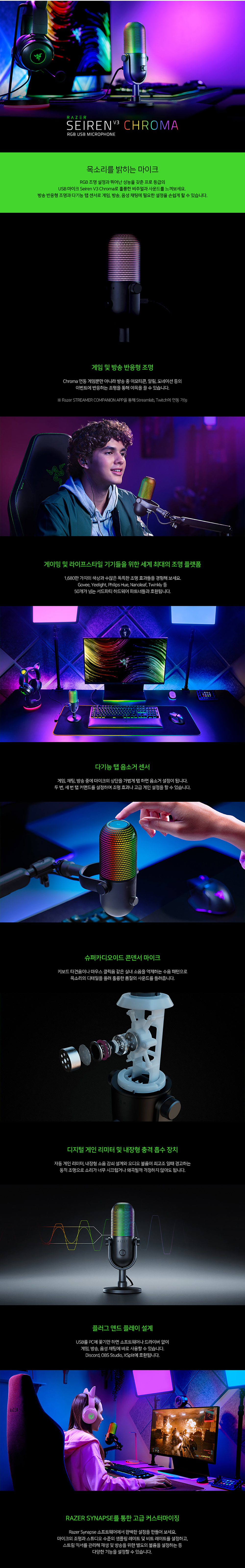 레이저 세이렌 V3 크로마 블랙 Razer Seiren V3 Chroma 유선 스트리밍 USB 마이크