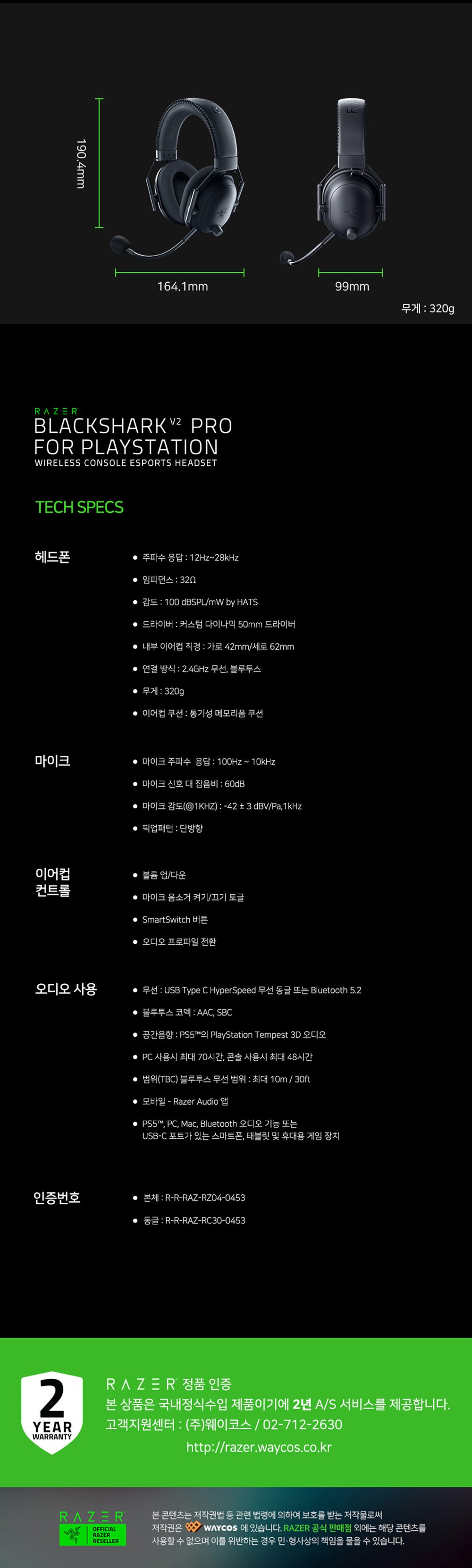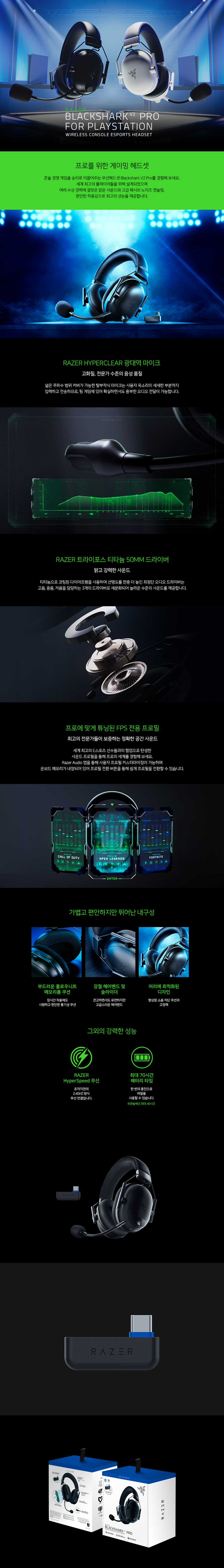 레이저 블랙샤크 V2 프로 블랙 PS5공식라이센스 PC호환 Blackshark V2 Pro for PlayStation 무선 게이밍 헤드셋