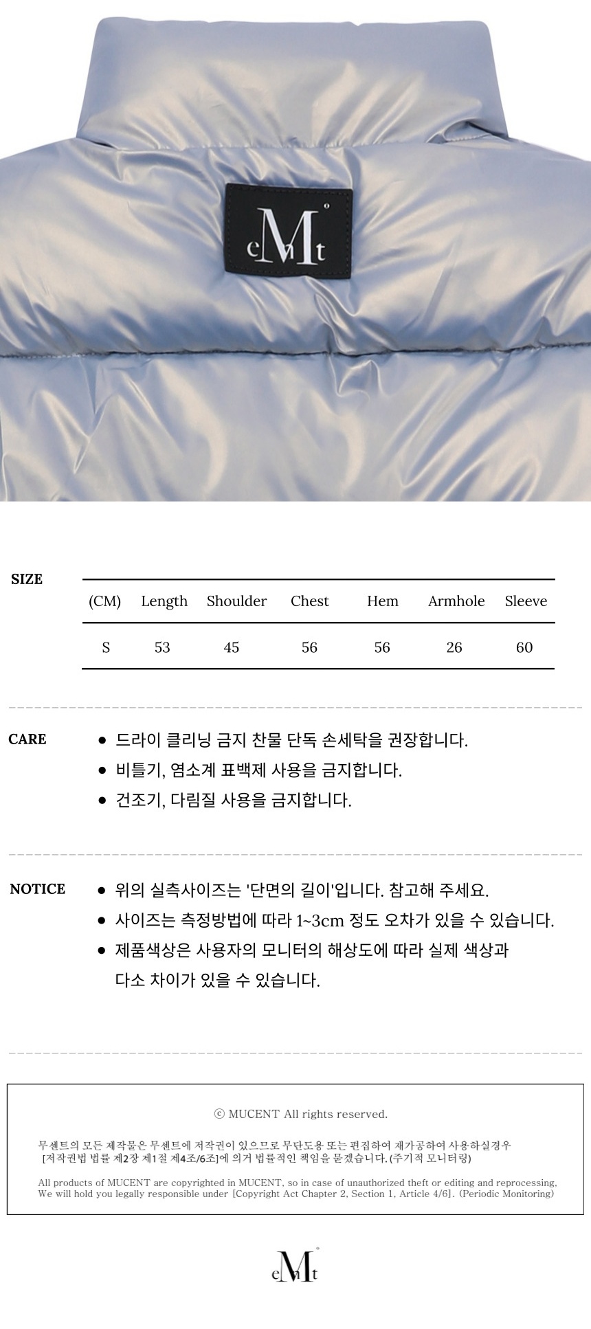 ┃Detail • 포켓에 무센트 라벨 디테일 • 후면부 블랙 레더 패치 포인트 • 밑단 스트링으로 두가지 핏 연출 가능 • 크롭한 기장감의 하이넥 패딩 • 추위에 바람을 막아줄 수 있는 소매 밴딩 • 글로시한 원단으로 유니크한 무드 ┃Material : 겉감: Polyester 100% , 충전재: Wellon 100% ┃Care : Dry cleaning - 무센트는 말기의 행성인 이 지구에서 지속 가능한 옷들을 고민합니다. 우리는 신념을 소비하는 미닝아웃을 지지합니다.