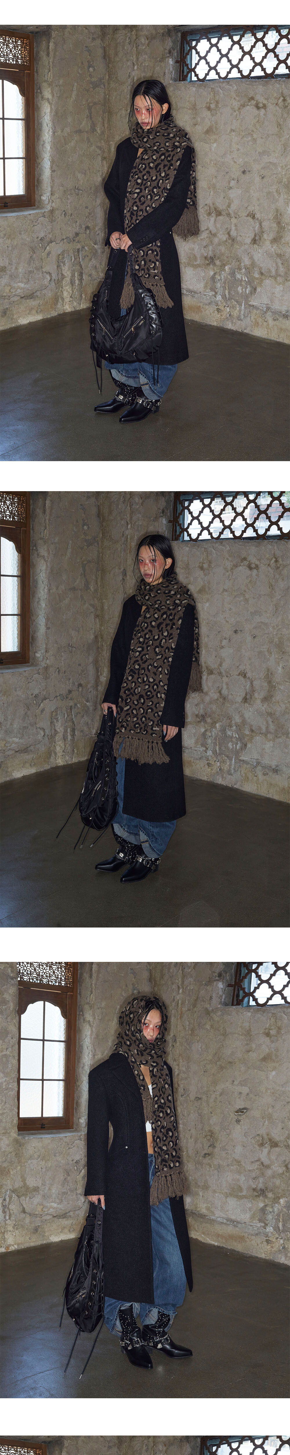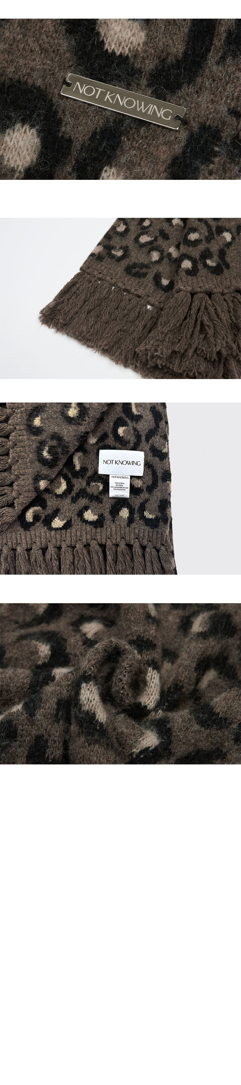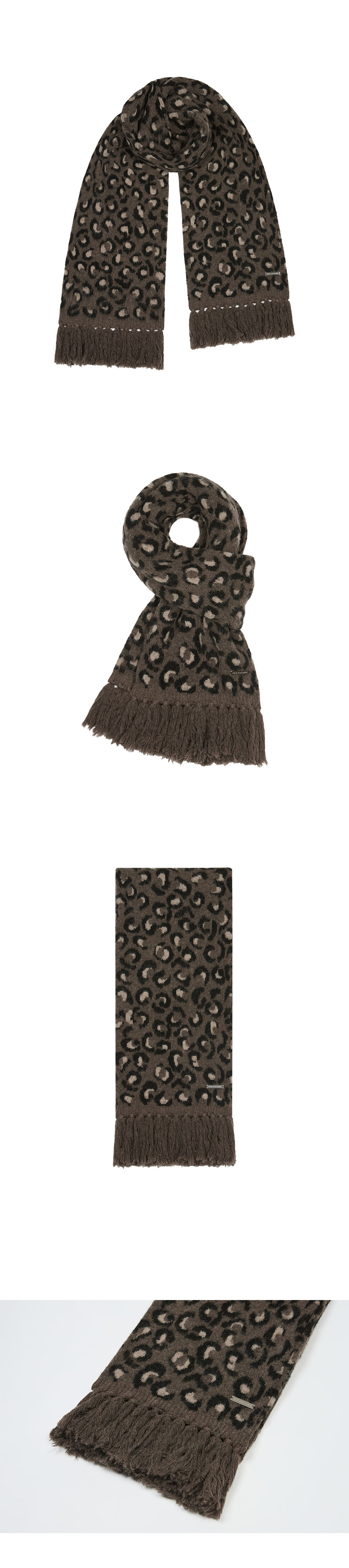 DESIGN SUMMARY *긴 기장감의 태슬 장식과 볼드한 레오파드 패턴이 포인트인 벌키한 무드의 머플러입니다. *볼드한 레오파드 패턴을 브러쉬 가공을 하여 소프트한 터치감으로 제작되었습니다. *알파카/울/캐시나일론 혼방소재를 사용하여 매우 부드러운 촉감이 특징입니다. 레오파드 패턴을 2겹 자카드(JQD) 처리하여 두께감이 도톰하고, 넓은 가로폭과 긴 기장감으로 착용시 보온성을 높여줍니다. FABRIC 15% ALPACA, 5% WOOL, 55% CASHMERENYLON 25% POLYESTER CARE *DRY CLEAN 권장 SIZE ONE SIZE -LEGNTH : 210cm -DEPTH : 28cm -TASSEL : 12cm