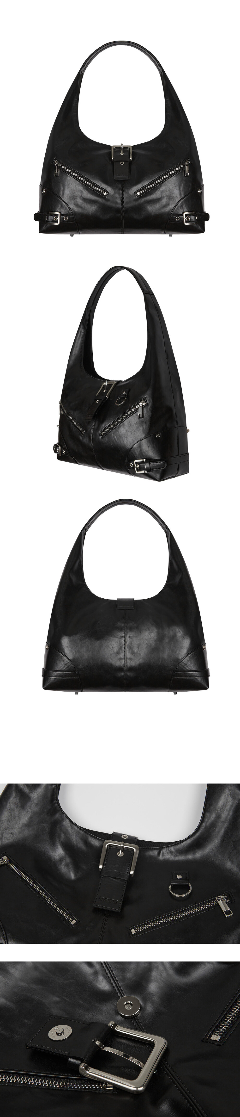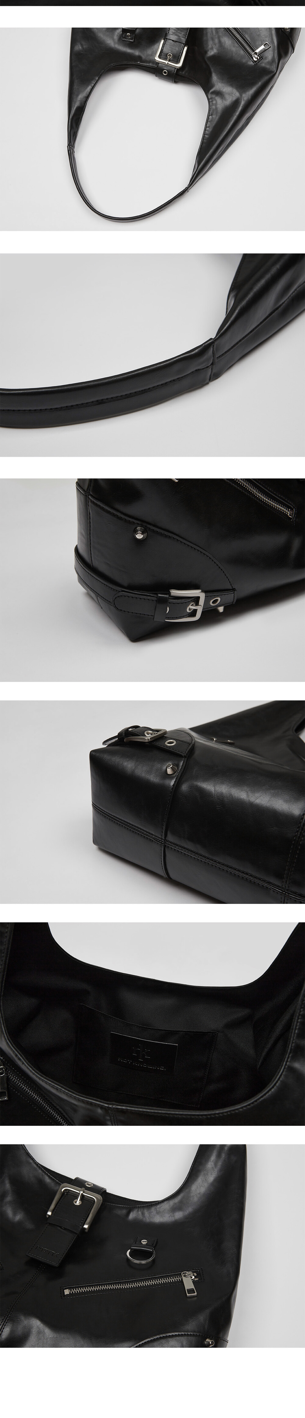 DESIGN SUMMARY *비건 크렉 레더 원단을 사용한 모토(MOTO) 모티브의 호보백 입니다. *수납부분 40mm 메탈 헤비 버클, 좌/우 20mm 메탈 버클, 전면부 #5호 YKK 지퍼와 O-링 장식, 메탈 엣지 스터드 디테일이 있습니다. *중심부 메탈 버클은 자석으로 여닫도록 디자인 하였습니다. *최대 15인치 노트북까지 수납이 가능합니다. FABRIC 100% POLYURETANE CARE *오염된 부분은 얇은 천으로 가볍게 문질러서 지워주세요. SIZE ONE SIZE -HEIGHT : 53cm (손잡이 높이까지) -WIDTH : 41cm -HANDLE HEIGHT : 30cm