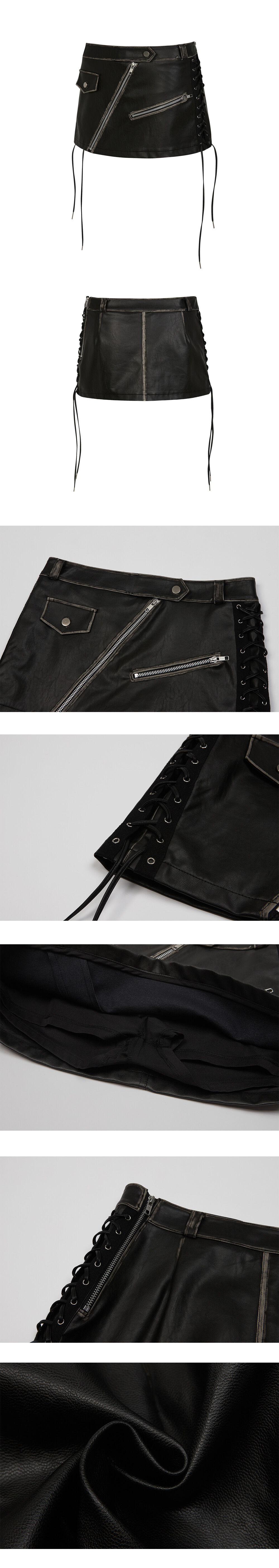 DESIGN SUMMARY - 워시드(Washed) 비건 레더를 사용하여 제작한 모토 모티브의 미니 스커트 입니다. - 앞중심 비대칭 실버 메탈 지퍼와 기능성 좌측 지퍼 포켓, 우측 실버버튼 포켓 덮개로 디자인 포인트를 주었습니다. - 사이드 아일렛 테잎과 레더 스트링 레이스 업 디테일이 있습니다. - 스트레이 안감 속바지가 스커트 내부에 붙어 있습니다. FABRIC SKIRT : 100% POLYURETANE INNER : 100% POLYESTER CARE *에이징 비건 레더 원단을 사용하여 시간이 지남에 따라 자연스럽게 워싱이 됩니다. *알콜 및 에탄올에 원단이 약하기에 묻지 않도록 주의 부탁 드립니다. SIZE SMALL SIZE -WAIST : 37.5cm -HIP : 44cm -BOTTOM : 49cm -LENGTH : 29cm MEDIUM SIZE -WAIST : 39cm -HIP : 49.5cm -BOTTOM : 51.5cm -LENGTH : 30cm