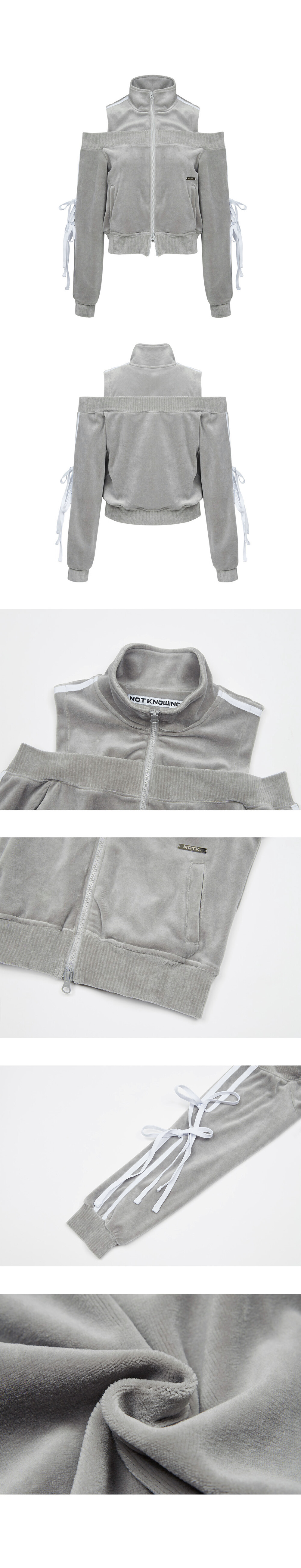 DESIGN SUMMARY 오프숄더 디자인에 슬리브리스 탑을 레이어드하여 입은듯, 두가지 스타일이 믹스되어 레이어드된 벨루어 원단의 트랙 탑 입니다. 숄더에서 이어지는 2줄 러셀테잎은 슬리브 부분에서 2개의 리본으로 연출이 가능하도록 부분적으로 떨어지게 디자인되었습니다. 2way 비슬론 지퍼, 메탈바 라벨, 좌/우 주머니로 마무리 했습니다. FABRIC 81% COTTON, 19% POLYESTER CARE *단독 찬물 손세탁을 권장합니다. *건조기 사용시 사이즈 변동이 있을 수 있으니 자연 건조를 권장합니다. SIZE ONE SIZE -SHOULDER : 32cm -CHEST : 45.5cm -SLEEVE : 54cm -LENGTH(BACK) : 49cm -BOTTOM : 40.5cm
