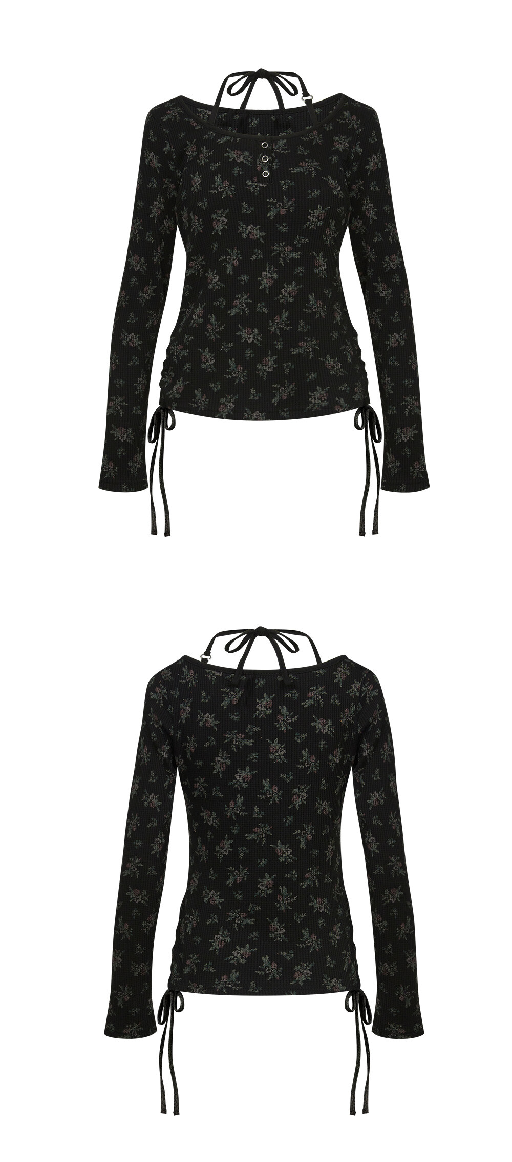 DESIGN SUMMARY - 로즈(Rose) 그래픽의 와플 원단을 사용하여 제작된 홀터 스트랩 탑입니다. - 넓은 U넥과 넥을 가로지르는 슬림한 스트랩이 포인트인 제품으로 왼쪽 넥 스트랩에 오링을 두어 낫노잉만의 메탈릭한 디테일을 주었고 이를 이용해 다양한 연출도 가능합니다. - 밑단 트임에 사이드 스트랩을 두어 리본 및 타이 디테일로 연출이 가능하며 길이를 조절하여 다양한 실루엣으로도 착용할 수 있습니다. FABRIC 100% COTTON CARE *DRY CLEAN 권장 SIZE ONE SIZE -SHOULDER : 39.5cm -CHEST : 43cm -SLEEVE : 62cm -LENGTH(BACK) : 52cm -BOTTOM : 42cm
