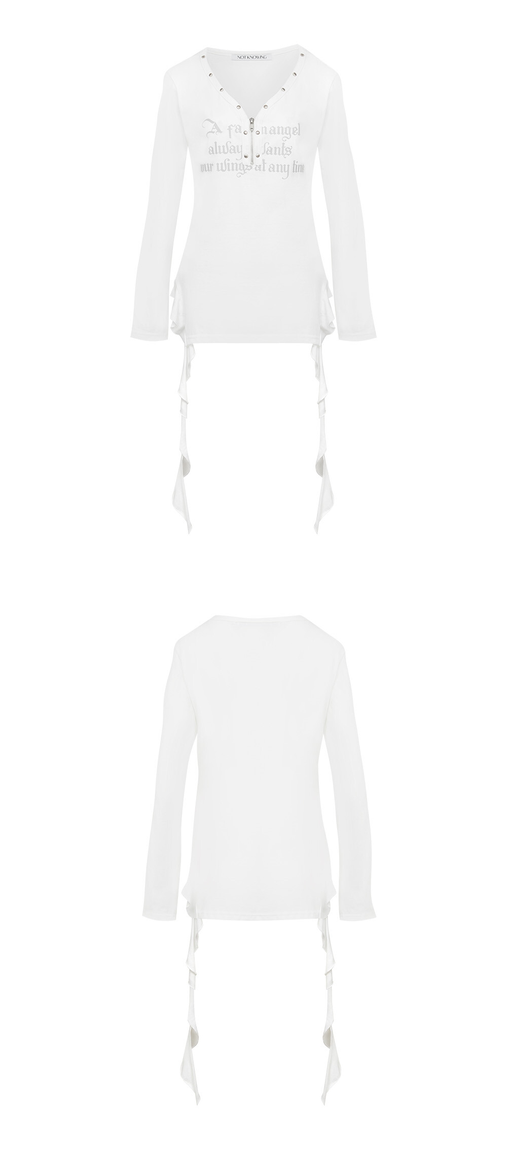 DESIGN SUMMARY - 레터링 그래픽과 스터드, 메탈지퍼, 러플 디테일들로 청키한 무드를 주는 V넥 러플 티셔츠 입니다. - 16수 코튼 원단을 사용한 롱한 기장감의 티셔츠로 앞 뒤 사이드 라인을 따라 흐르는 긴 러플 디테일이 포인트인 아이템입니다. - V넥 라인을 따라 웨스턴 스타일의 실버 스터드를 부착하였고 가운데의 ykk 지퍼를 오픈하여 오프숄더 형태로도 연출이 가능합니다. FABRIC 100% COTTON CARE *DRY CLEAN 권장 SIZE ONE SIZE -SHOULDER : 45cm -CHEST : 49cm -SLEEVE : 60cm -LENGTH(BACK) : 65cm -BOTTOM : 47cm