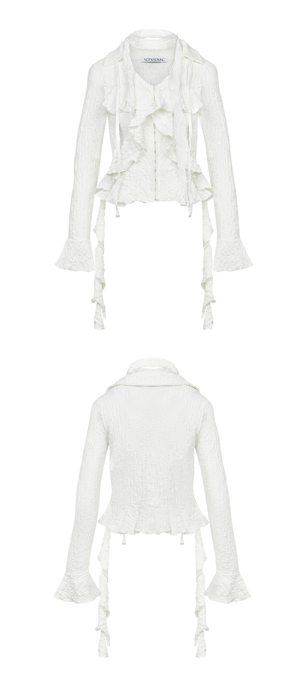 DESIGN SUMMARY - 코튼/나일론/스판 원단을 사용하여 제작된 그런지 러플블라우스의 롱슬리브 버전의 제품입니다. - 전체적으로 슬림하고 탄탄한 핏감을 주며 , 몸판의 러플과 소매 밑단의 넓은 러플 디테일이 특징입니다. - 넥 스카프를 통해 다양한 연출이 가능하며, 롱슬리브 버전에서 새롭게 추가된 싱글카라와 카라의 긴 스트랩을 통해 그런지한 무드를 연출할 수 있습니다. - 앞 중심은 후크 테잎 여밈으로 착용이 가능하도록 하였습니다. FABRIC 67% COTTON, 30% NYLON, 3% SPANDEX CARE *DRY CLEAN 권장 SIZE ONE SIZE -SHOULDER : 38cm -CHEST : 40cm -SLEEVE : 57cm -LENGTH(BACK) : 42cm -BOTTOM : 34cm
