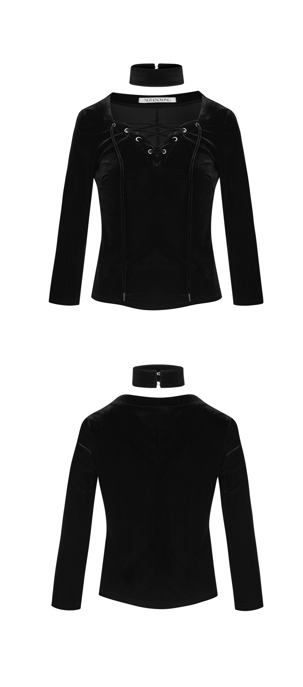 DESIGN SUMMARY - 은은한 광택감이 특징인 벨루아 원단으로 제작된 하트넥 쉐입의 7부 레이스업 탑 입니다. - 하트넥 라인의 넥 쉐잎이 포인트이며 라인을 따라 메탈 아일렛과 벨루아 스트링으로 레이스업되는 디테일을 두어 러블리한 락시크 무드를 연출할 수 있는 아이템입니다. - 몸판과 같은 원단으로 제작된 넥 초커가 포함된 제품으로 2개의 후크 여밈으로 착용이 가능합니다. FABRIC 92% POLYESTER, 8% SPANDEX CARE *DRY CLEAN 권장 (광택감 있는 벨루아 제품 특성상 과한 마찰 발생시 이염의 우려가 있으니 단독세탁을 권장드리며 밝은 제품과의 착용을 피해주세요) SIZE ONE SIZE -SHOULDER : 39.5cm -CHEST : 43cm -SLEEVE : 62cm -LENGTH(BACK) : 52cm -BOTTOM : 42cm