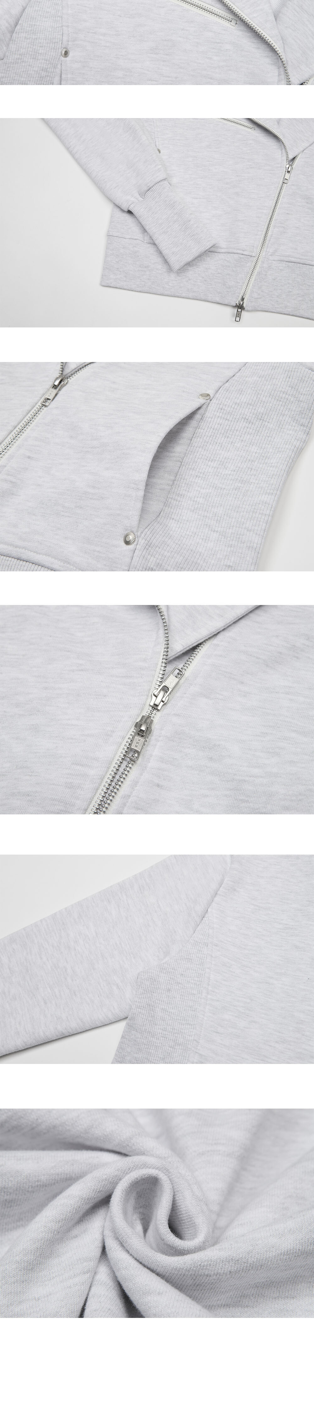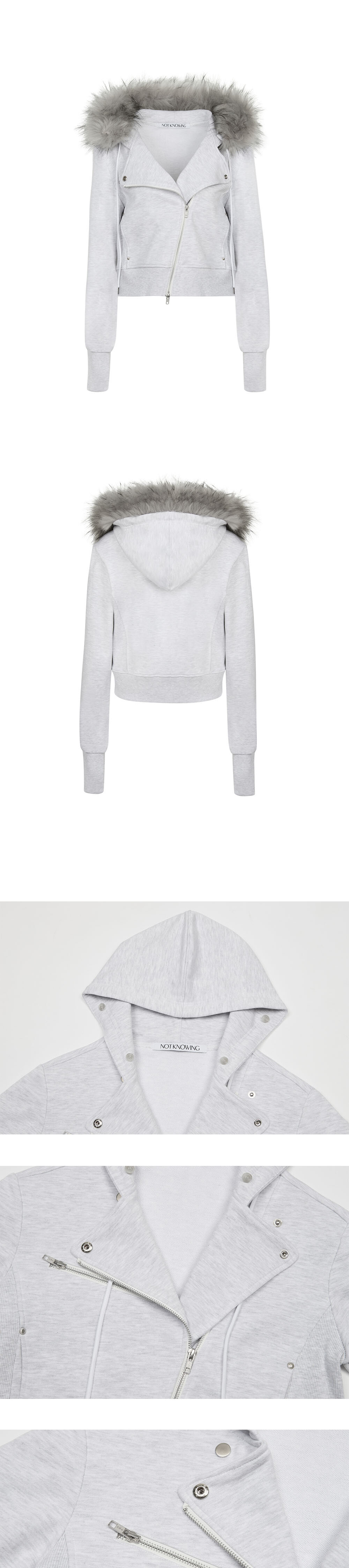 DESIGN SUMMARY - 퍼 트리밍과 라이더 무드가 합쳐진 스웻 후드 집업입니다. - 후드의 퍼 트리밍은 톤온톤 컬러의 풍성한 퍼 원단을 사용하였고 후드 안쪽에 부착되어 있는 단추로 탈부착이 가능하여 탈착시 한여름을 제외하고 모두 착용하실 수 있습니다. - 덤블, 덴타 가공된 코튼 스웻 원단으로 제작되었습니다. - 라이더 자켓 스타일의 후드 집업으로 2way의 사선 지퍼가 포인트입니다. - 가슴 쪽 메탈 지퍼, 라펠 장식 실버 스냅, 포켓 엣지 스터드로 메탈 부자재를 사용하여 장식하였습니다. - 소매 립쁘에 핑거 홀을 두어 다양하게 연출이 가능합니다. FABRIC 100% COTTON FUR - 100% POLYESTER CARE *DRY CLEAN 권장 SIZE ONE SIZE -SHOULDER : 45cm -CHEST : 48cm -SLEEVE : 66.5cm -LENGTH(BACK) : 50cm -BOTTOM : 45cm