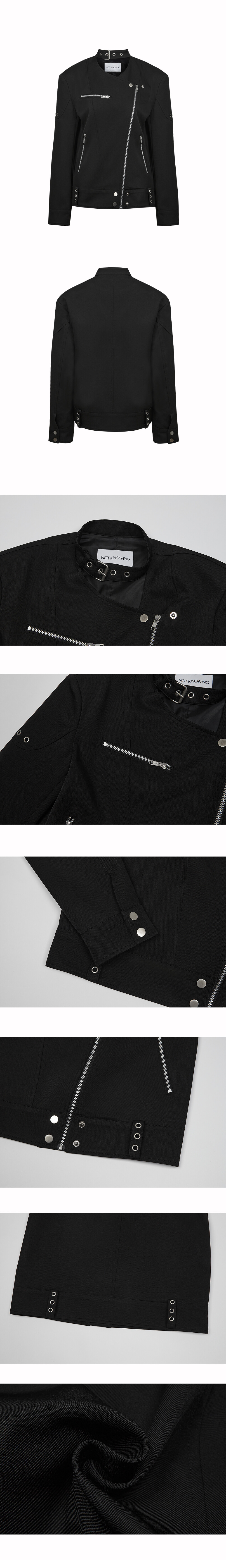 DESIGN SUMMARY - 라이트한 폴리스판 원단을 사용한 초커 카라 포인트의 라이더 자켓 입니다. - 부드럽게 드레이프 지는 원단을 사용하여 착용 시 무겁지 않고 편안하게 옷이 놓이도록 하였고 8mm 어깨패드를 통해 적당한 쉐잎이 지도록 하였습니다. - 사이즈 조절이 가능한 초커 카라 넥, 언밸런스 전면부 오픈 지퍼, 체스트&앞 포켓 지퍼로 전체 디테일을 만들었습니다. - 앞쪽 언밸런스 한 부분은 지퍼 외에도 메탈 스냅을 통해 고정이 가능하며 소매 또한 2개의 메탈 스냅으로 오픈이 가능합니다. - 밑단 부분 벨트고리 부분에 각각 3개의 메탈 아일렛 디테일이 포인트로 들어가 있습니다. FABRIC (BODY) : 96% POLYESTER, 4% SPAN (LINING):100% POLYESTER CARE *DRY CLEAN 권장 SIZE ONE SIZE -SHOULDER : 48cm -CHEST : 52.5cm -SLEEVE : 60cm -LENGTH(BACK) : 60cm -BOTTOM : 50cm