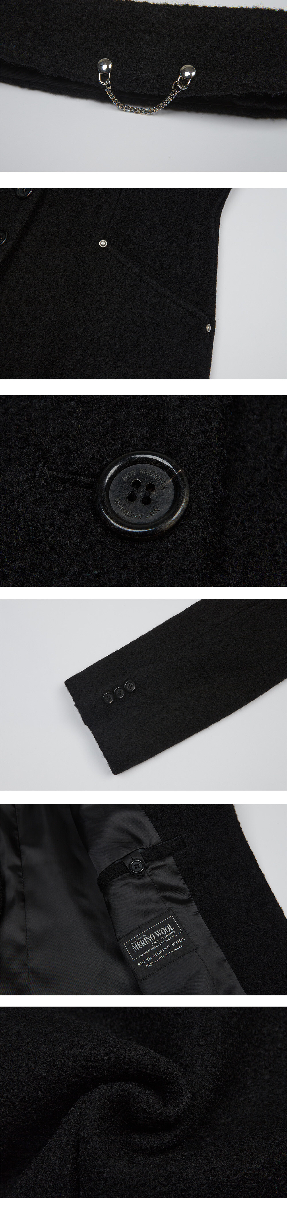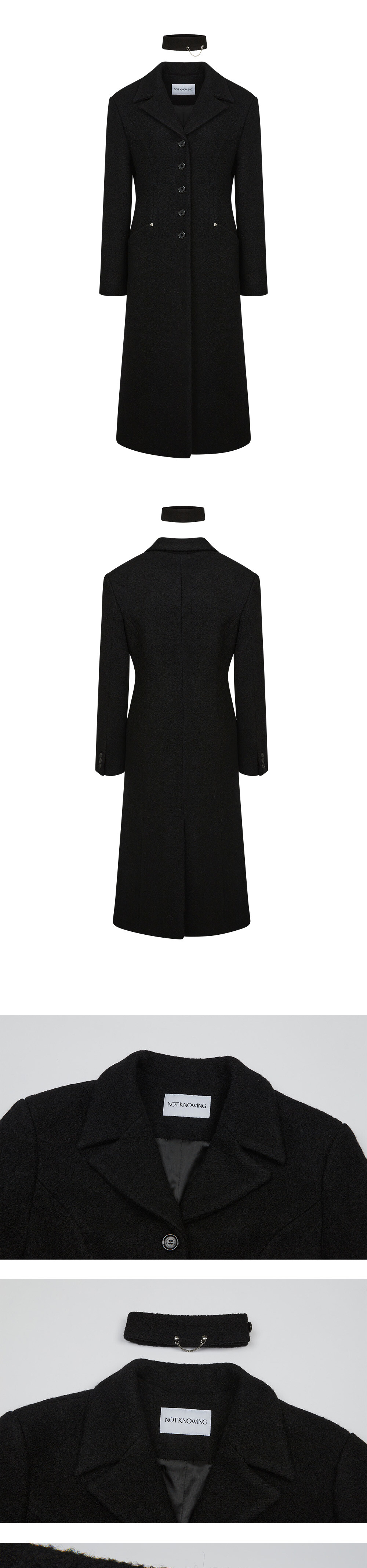 DESIGN SUMMARY -부드러운 터치감의 울 100% 부클 원단을 사용하여 제작한 초커 카라 포인트의 롱코트 입니다. -코트와 동일한 부클 원단으로 만들어진 넥 초커가 세트인 제품으로 한쪽에 체인 스터드 장식을 더해 전체적인 무드에 포인트가 되어주는 아이템입니다. -10mm 숄더패드가 내장되어 있어 어깨에서 떨어지는 라인은 잡아주면서 허리 부분을 슬림하게 설계하여 아워글라스 쉐잎의 실루엣으로 디자인했습니다. -앞 중심에 5개의 버튼을 좁은 간격으로 배치하여 슬림한 허리라인을 더 강조하였고 코트 포켓 엣지에 9mm 실버 스터드로 장식하여 포인트를 주었습니다. FABRIC (SHELL) : 100% WOOL (LINING): 100% POLYESTER CARE *DRY CLEAN 권장 SIZE ONE SIZE -SHOULDER : 45cm -CHEST : 48cm -WAIST : 42cm -SLEEVE : 60cm -LENGTH(BACK) : 115cm -BOTTOM : 61cm