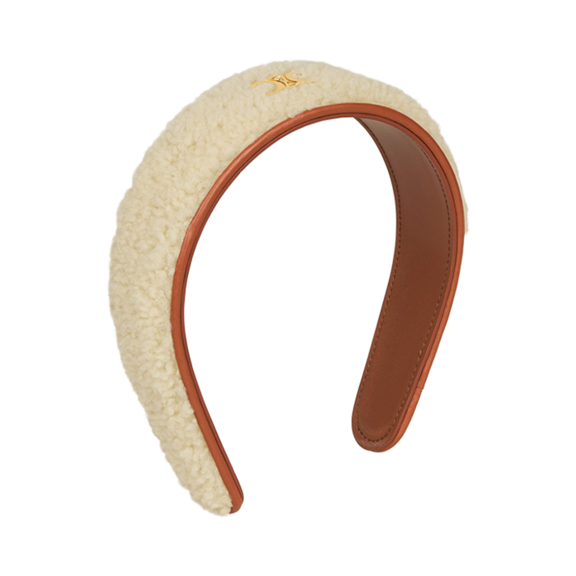 (W) Celine Triomphe Headband in Shearling, Calfskin and Brass with Gold Finish White Tan Gold