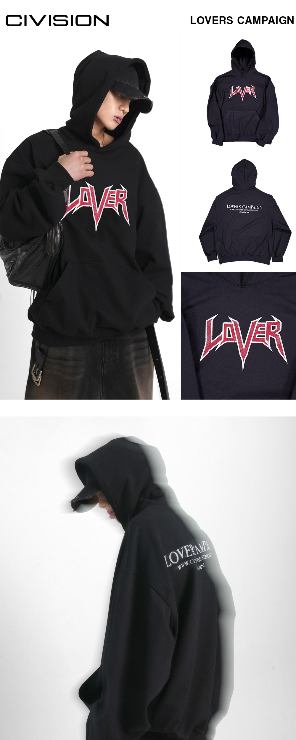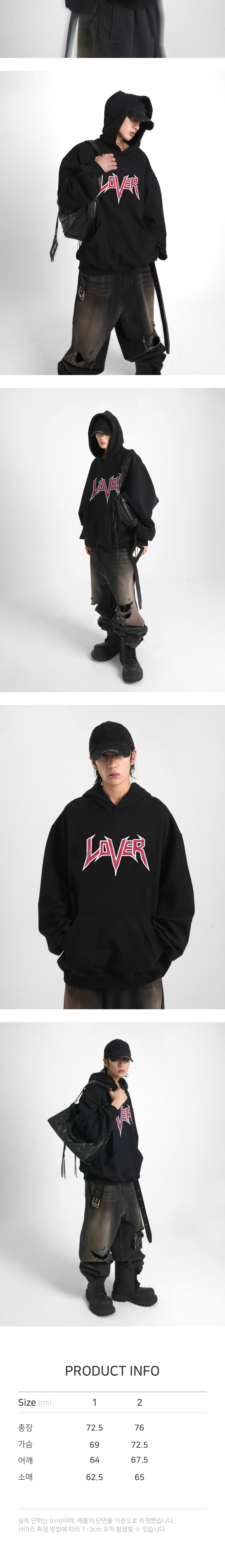 [PRODUCT INFORMATION] 제조국: 한국 (Made in KOREA) 소재: 코튼 100% (Cotton 100%) -헤비 웨이트 후디 (Heavy weight hoodie) -앞면의 디스트로이드 러버 로고 프린트 (Destroyed lover logo printed at front) -뒷면의 캠페인 아트워크 프린트 (Campaign artwork printed at back) -소매와 밑단의 립 처리 (Ribbed cuffs, hem) -세미 오버사이즈 핏 (Semi-oversized fit)