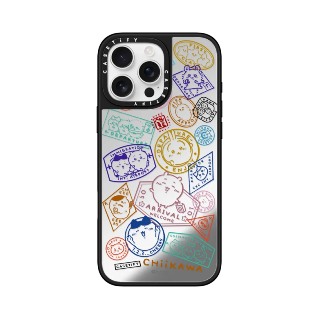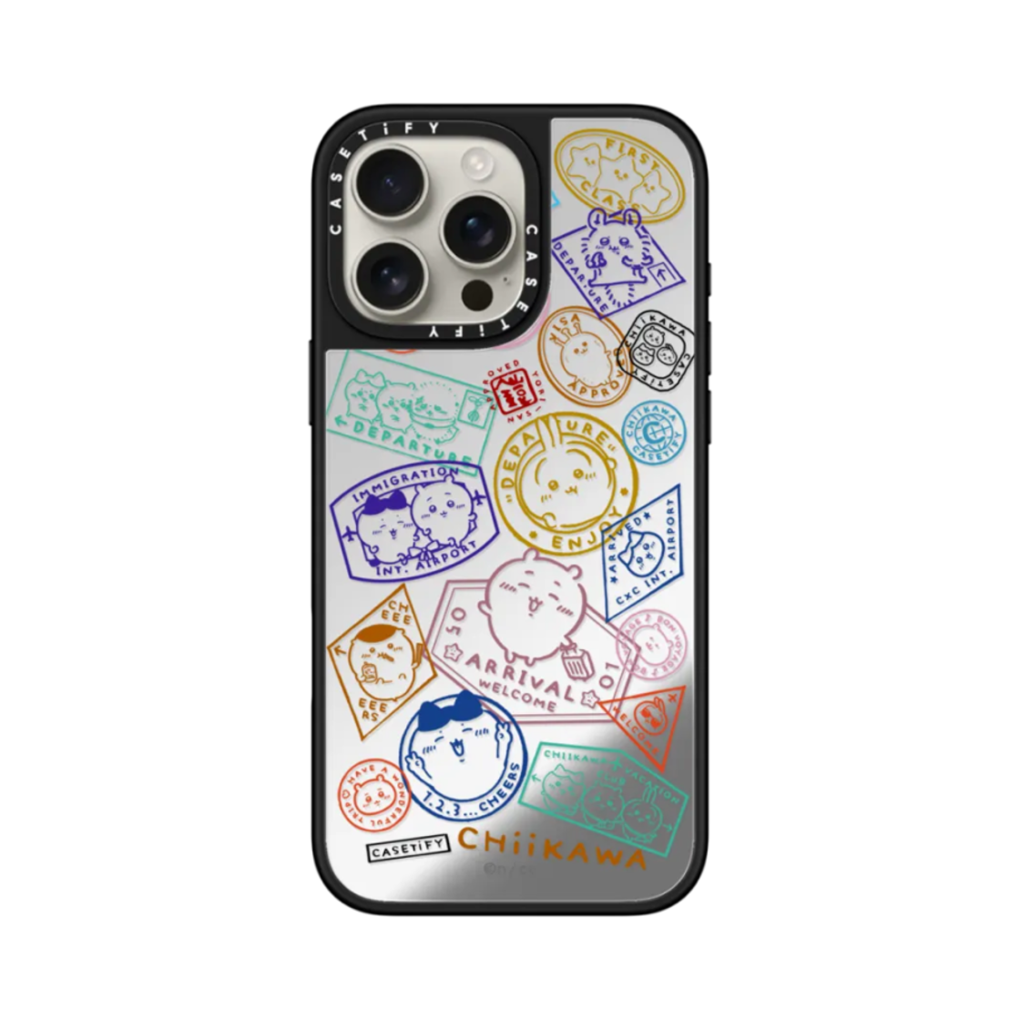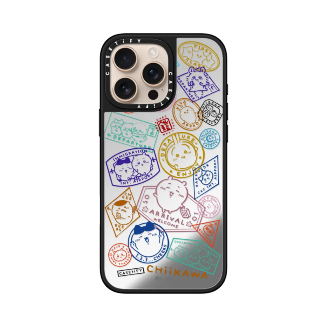 Casetify x Chiikawa Chiikawa Travel Visa Stamp iPhone Magsafe Silver Mirror Black Bumper Case