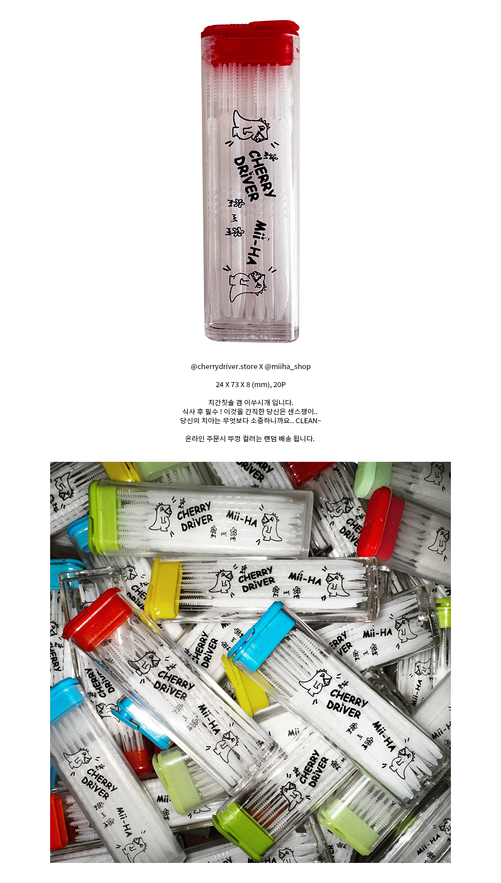 @cherrydriver.store X @miiha_shop 24 X 73 X 8 (mm), 20P 치간칫솔 겸 이쑤시개 입니다. 식사 후 필수 ! 이것을 간직한 당신은 센스쟁이.. 당신의 치아는 무엇보다 소중하니까요.. CLEAN~ 온라인 주문시 뚜껑 컬러는 랜덤 배송 됩니다.