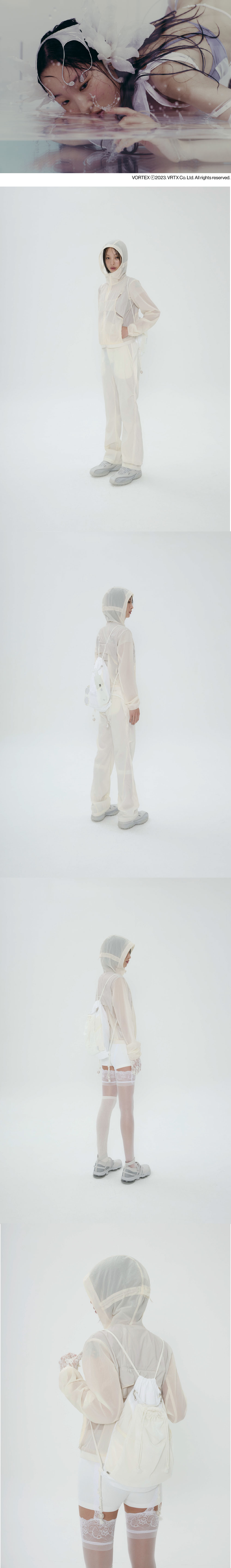 세 개의 쉬어한 메쉬 소재 주머니가 있는 짐색 - 카라비너를 활용하여 다양한 수납방식 연출 - 탈부착 핸들을 활용하여 다양한 스타일링 - 쉬어한 메쉬 소재를 사용하여 가벼운 분위기 - 속으로 수납 가능한 전면 메쉬 주머니 - 전면 메쉬주머니 옆 로고 라벨 부착 - 전면 하단에 1 way coil 지퍼 - 어깨끈 하단에 부착된 컬러매칭된 구슬들