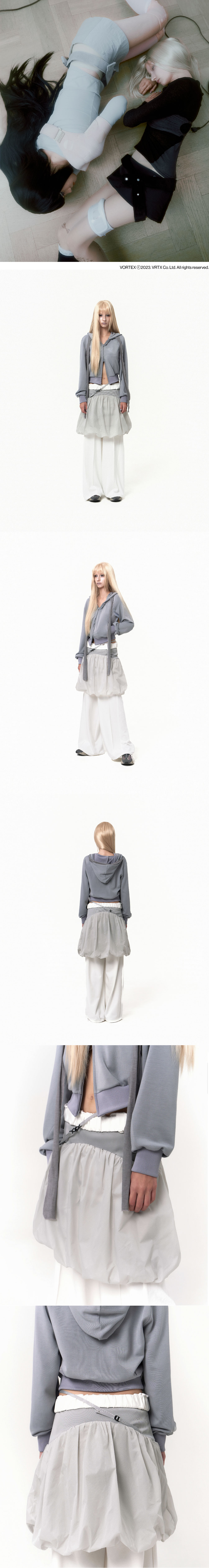 양방향 착용으로 다양한 스타일링이 가능한 미디 기장 스커트 A면 | 퍼프 디테일 스커트 | 앞, 뒤 한쪽의 사이드 포켓 | 포켓의 히든 스트랩으로 다양한 스타일링 가능 B면 | 본딩 나일론 소재의 패딩 스커트 | 전면 심볼 로고 전사