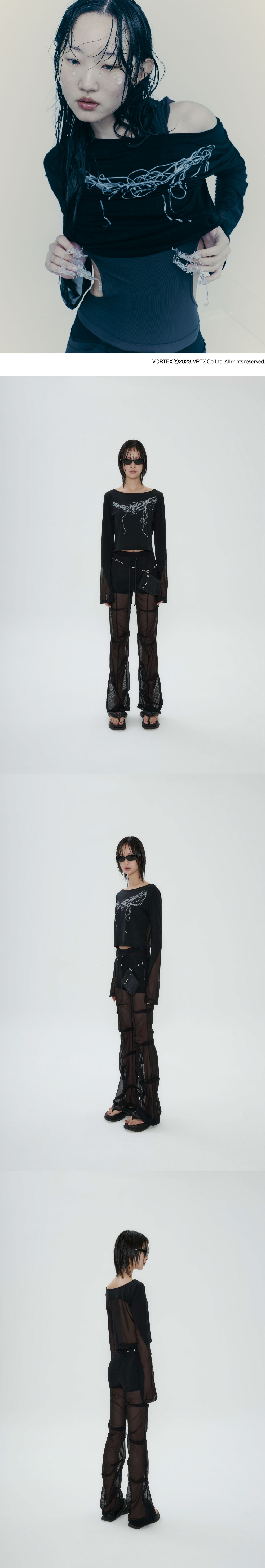 앞, 뒤 양방향 착용이 가능한 롱슬리브 - 소매에서 몸판으로 이어지는 메쉬 배색 티셔츠 - 전면 시즌 그래픽 프린팅 디테일
