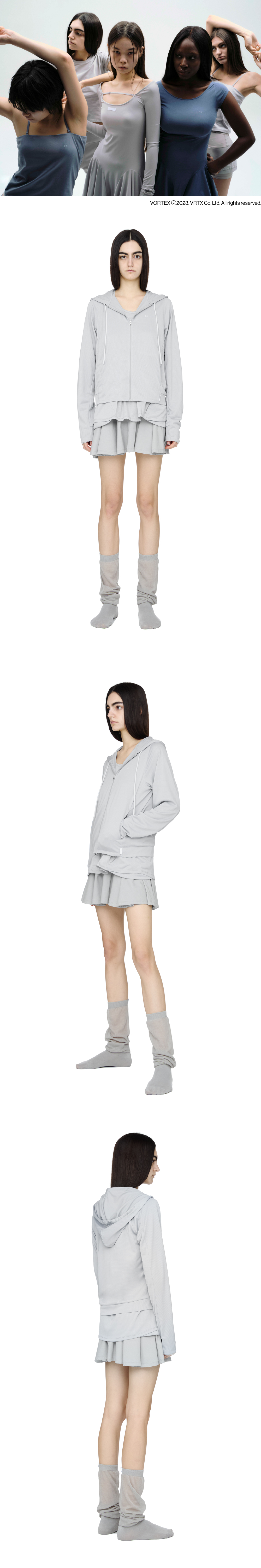 OJOS의 에센셜 라인 i:e 후디집업 |세미크롭핏 |전면 ie 로고 전사 |가볍고 통기성 좋은 메쉬 원단 |기능성 ATB-UV+ 소재 |소매 끝 메쉬 디테일 |데일리한 원마일웨어 |전면에 YKK 지퍼 및 풀러 마감