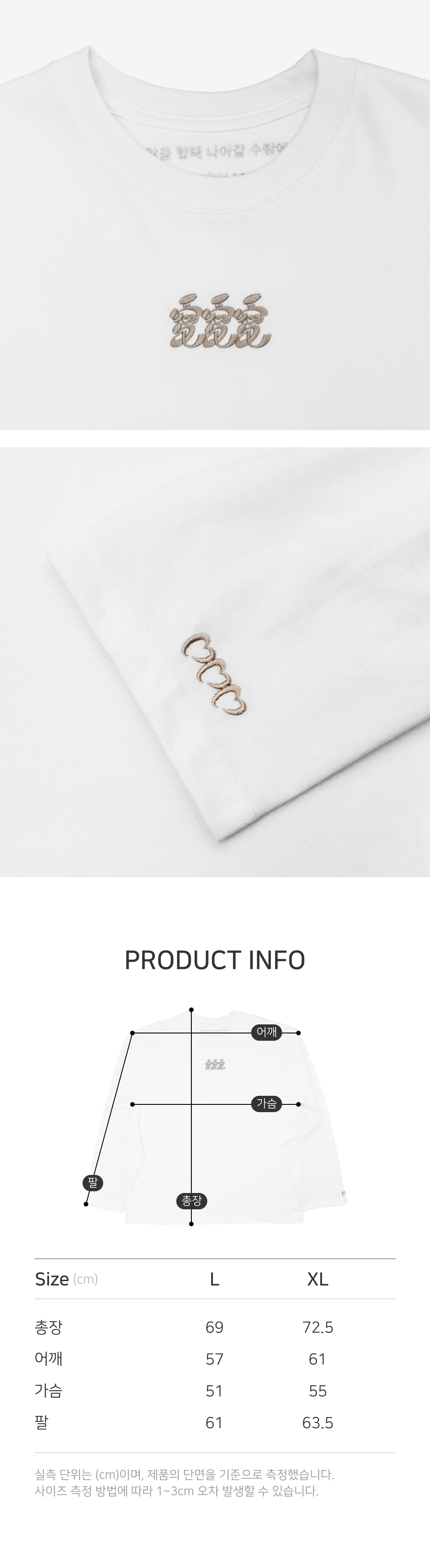 화이트 색상에 시그니처 그래픽을 베이지 자수로 장식한 헤비웨이트 티셔츠 입니다. 간절기와 초여름 까지 단품으로 외출이 가능한 코디가 가능하고, 겨울에는 가디건과 조합, 이너로도 훌륭합니다. 세미크롭한 총장의 길이와 상대적으로 긴 팔 길이의 패턴으로 트렌디한 핏을 연출 할 수 있습니다. 목 뒤 라벨을 자수로 대체하고 주요 라벨을 허리쪽으로 옮겨 이너로 착용했을 때의 피부 자극이나 불편함을 최소화 했습니다. 수축률 2%이내가 보장된 국내산 원사, 원단을 사용하여 물빨래와 건조기 사용에도 변형이 적은 티셔츠 입니다.