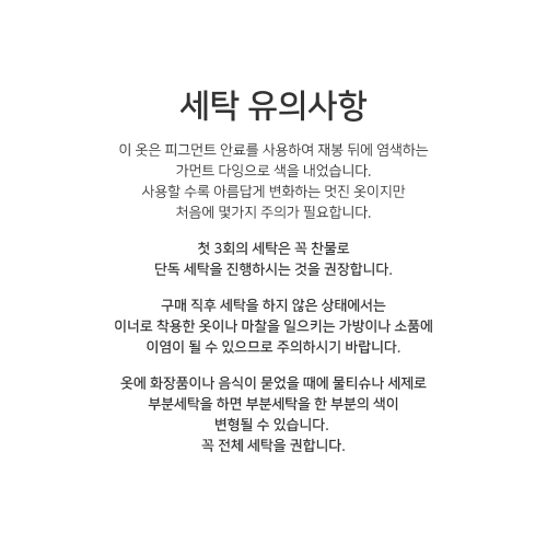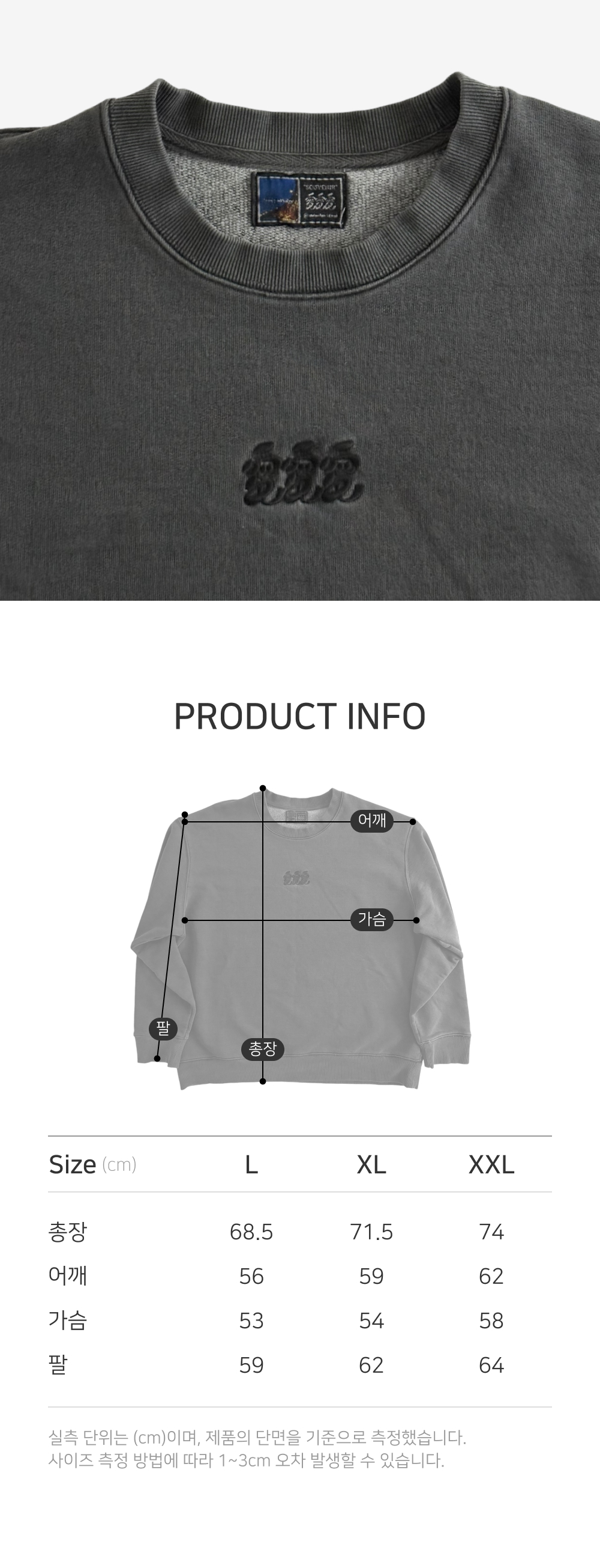 빈티지한 블랙 색상에 시그니처 그래픽을 블랙 자수로 장식한 헤비웨이트 스웻셔츠 입니다. 헤비웨이트 원단과 염색가공을 강조하기 위해 하단 립 부분의 둘레를 본판 패턴에 맞추어 재단하여 허리로 모이는 핏이 아닌 착용시 옷이 아래로 떨어지는 핏을 구현하였습니다. 피그먼트 안료를 사용하여 재봉 뒤에 염색하는 가먼트 다잉으로 색을 내었습니다. 피그먼트 안료로 가먼트 다잉된 옷은 사용할 수록 경년변화가 일어납니다. 수축률 적은 국내산 원사, 원단을 사용하여 물빨래와 건조기 사용에도 변형이 적은 스웻 셔츠 입니다.