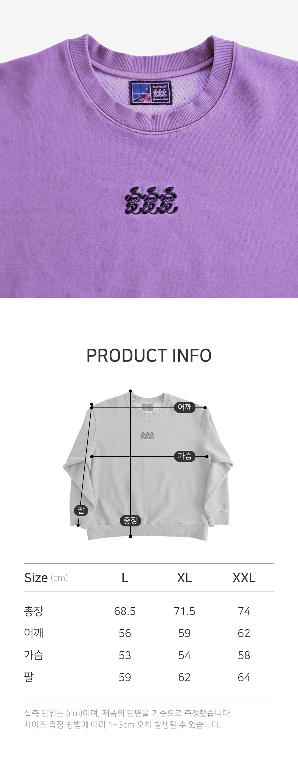 빈티지한 바이올렛 색상에 시그니처 그래픽을 블랙 자수로 장식한 헤비웨이트 스웻셔츠 입니다. 헤비웨이트 원단과 염색가공을 강조하기 위해 하단 립 부분의 둘레를 본판 패턴에 맞추어 재단하여 허리로 모이는 핏이 아닌 착용시 옷이 아래로 떨어지는 핏을 구현하였습니다. 피그먼트 안료를 사용하여 재봉 뒤에 염색하는 가먼트 다잉으로 색을 내었습니다. 피그먼트 안료로 가먼트 다잉된 옷은 사용할 수록 경년변화가 일어납니다. 수축률 적은 국내산 원사, 원단을 사용하여 물빨래와 건조기 사용에도 변형이 적은 스웻 셔츠 입니다.