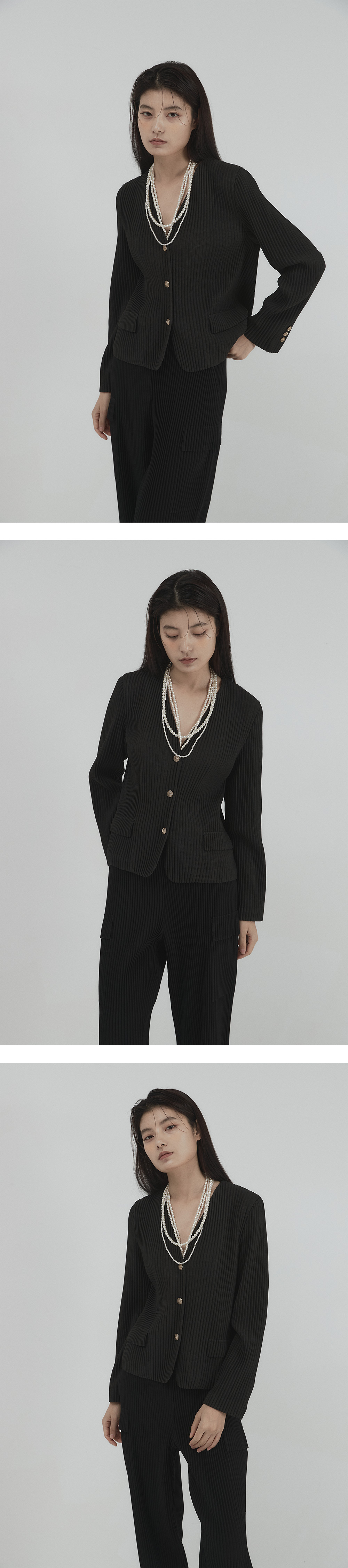 몽플리쎄 여성 논카라 플리츠 자켓 블랙