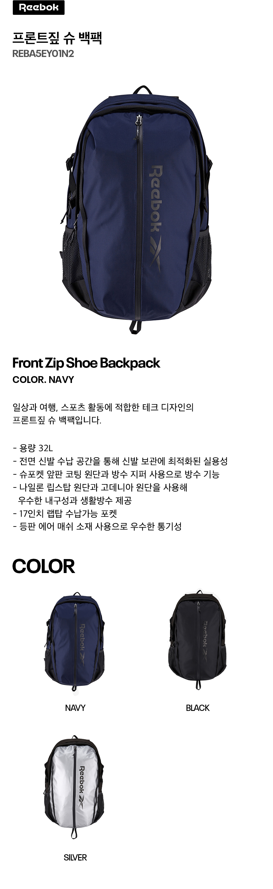 리복 프론트짚 슈 백팩 네이비