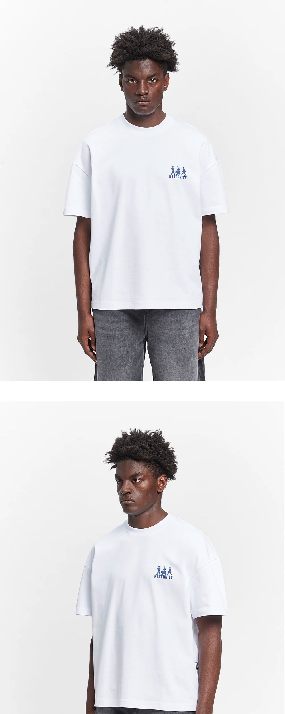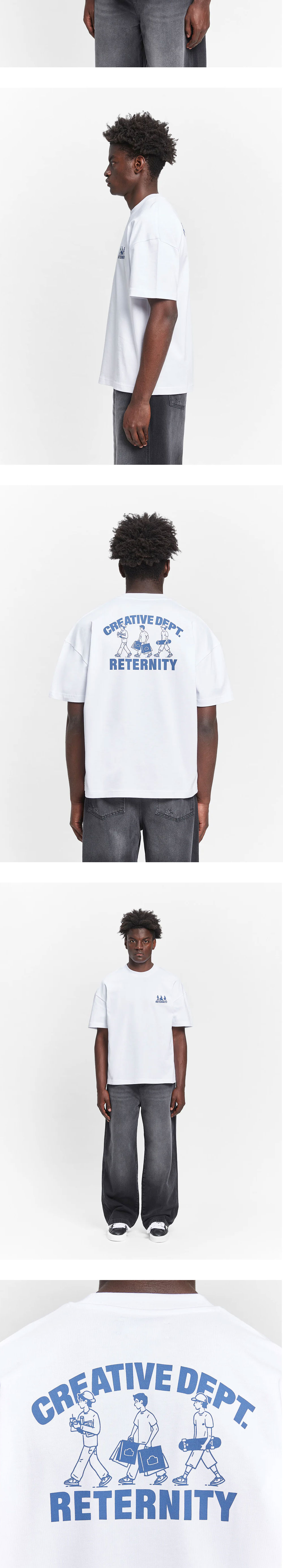 앞면과 뒷면의 블루 그래픽이 매력적인 리터니티의 크리에이티브 디파트먼트 로고 티셔츠 화이트입니다. - 박시한 실루엣 - 전/후면 CD 프린팅 - 295gsm 코튼 100% - Handmade in Europe * 모델: 185cm, L 사이즈 착용