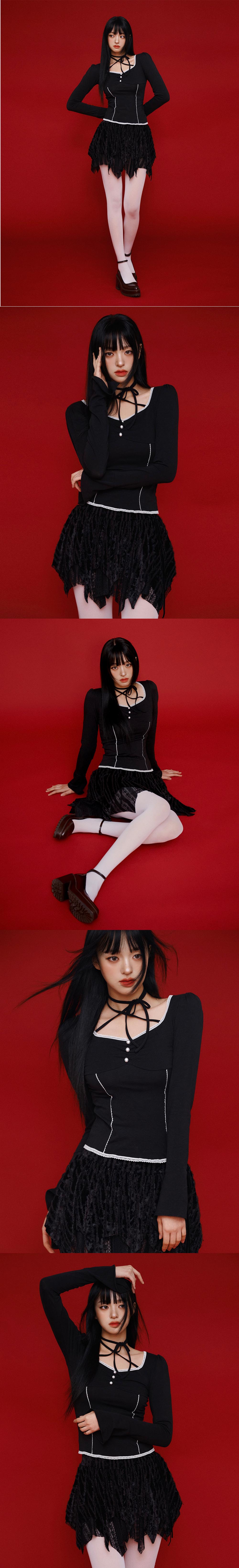 뉴얼린 리즈 셔링 레이스 롱슬리브 블라우스 블랙
