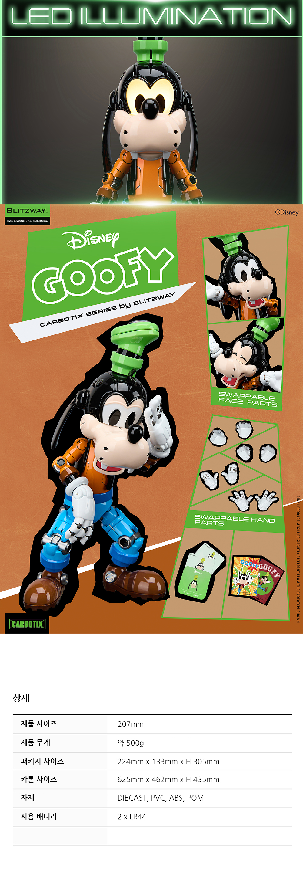 [Product Detail] Weight Approx. : 500g (Product only) / 1.2kg (Including Package) Dimension Approx. – Package : W 313 mm x D 234 mm x H 140 mm – Carton : W 655 mm x D 500 mm x H 450 mm [12 pc / 1 carton] *Dimension and weight could be changed later. [Materials] – Figure: Die-cast, PVC, ABS, POM – Package : PET Blister, Color EPP + Color Box