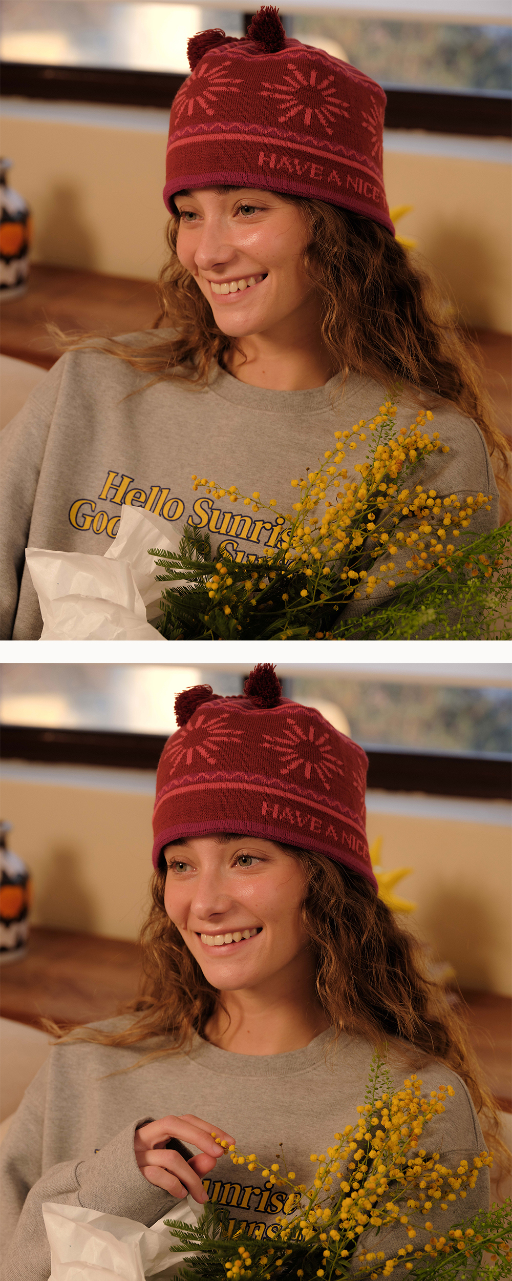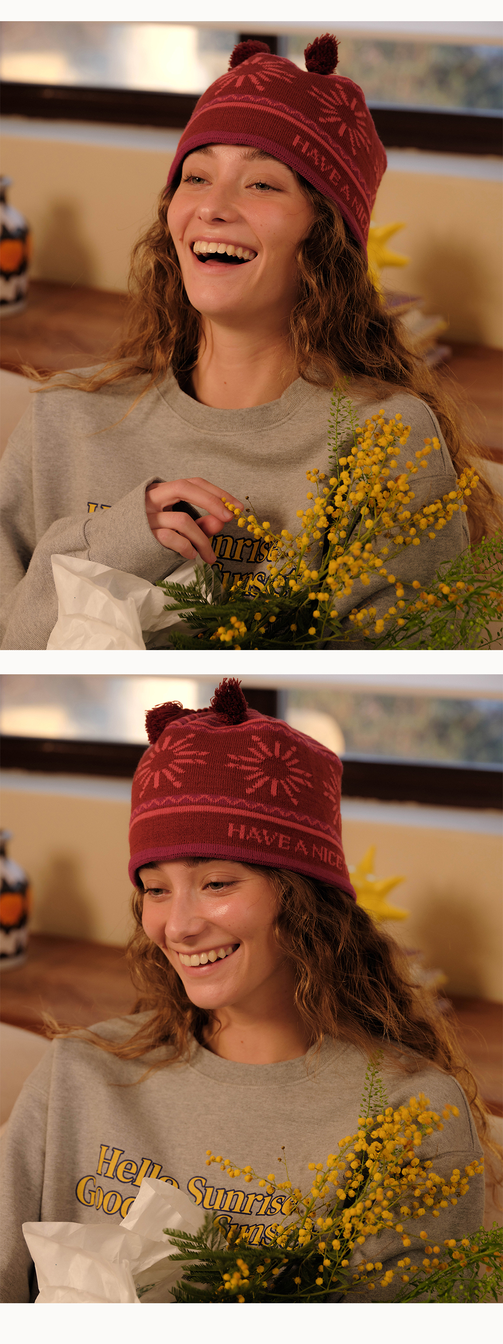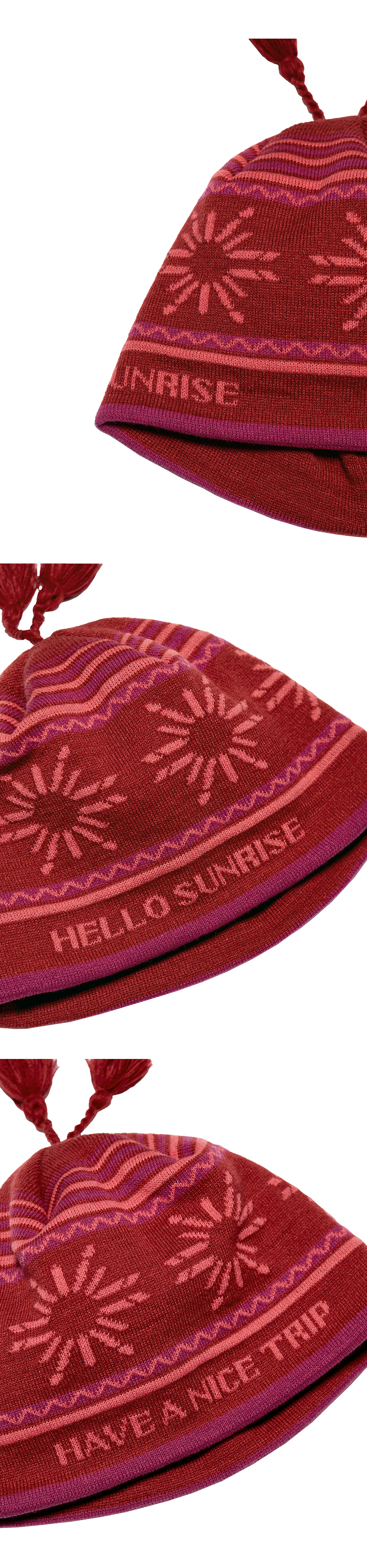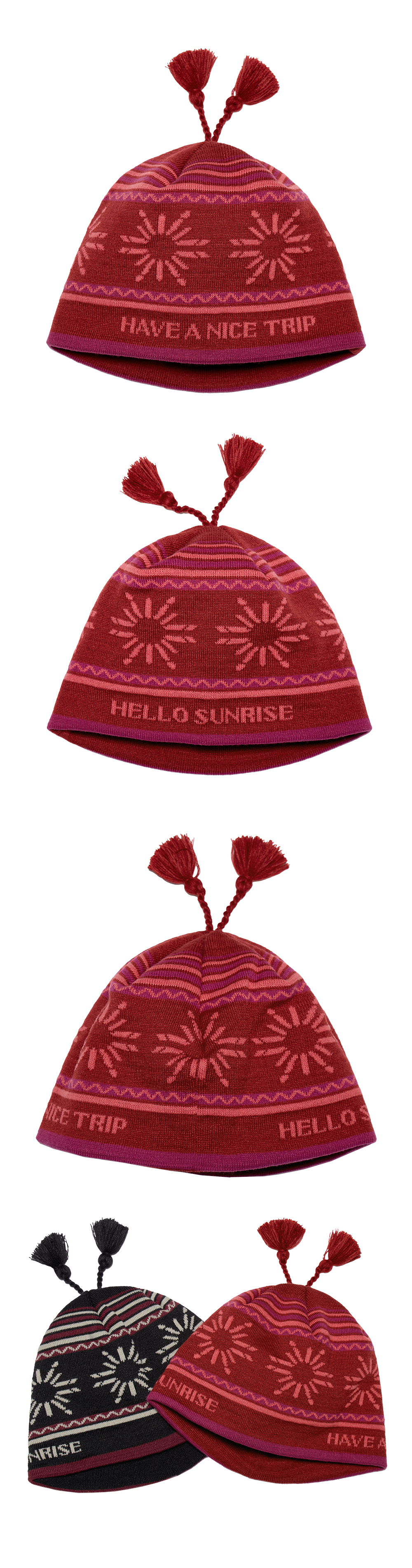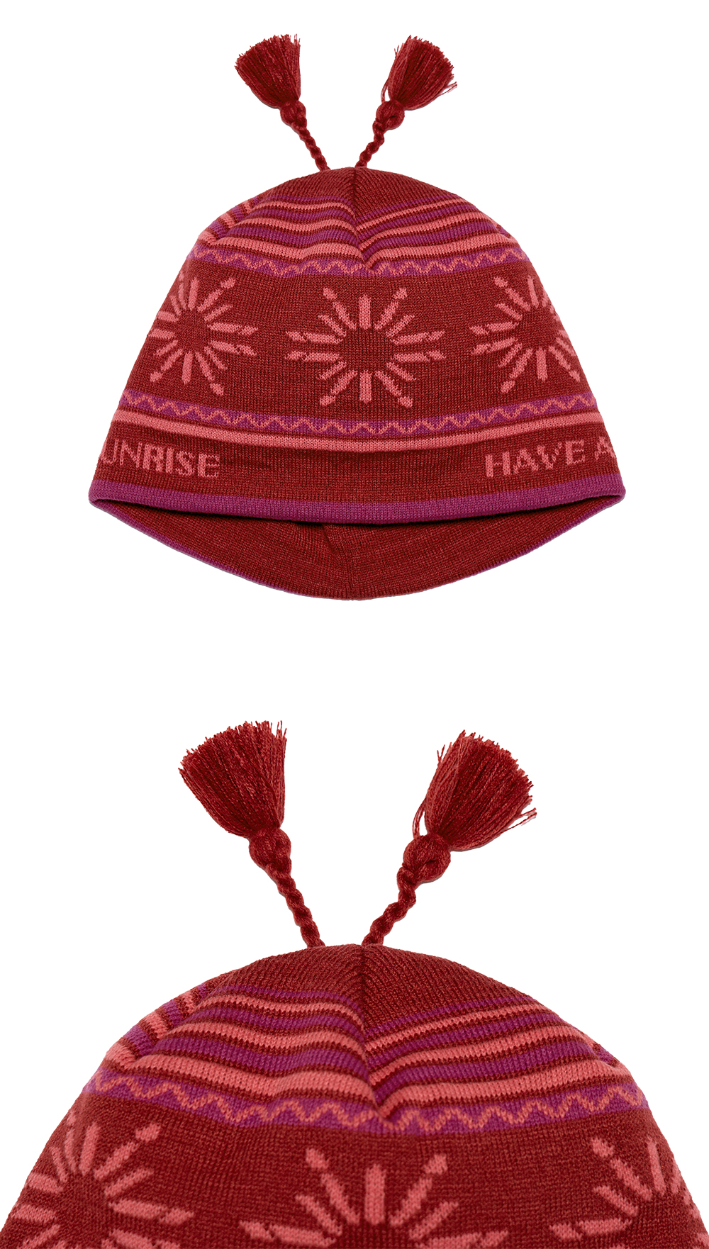 헬로선라이즈 심볼 및 타이포가 자가드로 들어간 테슬 비니입니다. - 직접 개발한 컬러 사용으로 포인트 - 심볼 그래픽 자가드 디테일 - 타이포 그래픽 자가드 디테일 - 상단 테슬 디테일 * 개인적인 취향에 따라 원하시는 방향으로 착용하시길 권장 드립니다. * 니트 재질 특성상 1-2cm의 차이가 있을 수 있습니다. * Acrylic 100% Made in Korea