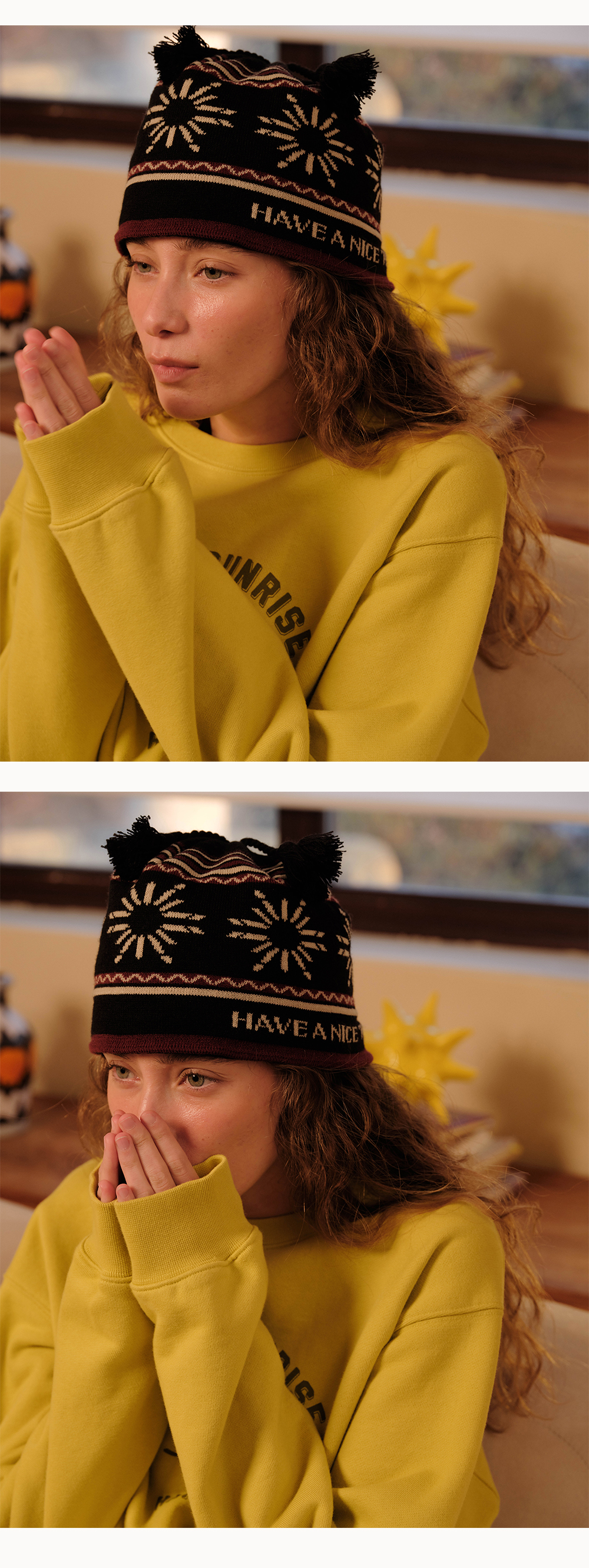 헬로선라이즈 심볼 및 타이포가 자가드로 들어간 테슬 비니입니다. - 직접 개발한 컬러 사용으로 포인트 - 심볼 그래픽 자가드 디테일 - 타이포 그래픽 자가드 디테일 - 상단 테슬 디테일 * 개인적인 취향에 따라 원하시는 방향으로 착용하시길 권장 드립니다. * 니트 재질 특성상 1-2cm의 차이가 있을 수 있습니다. * Acrylic 100% Made in Korea
