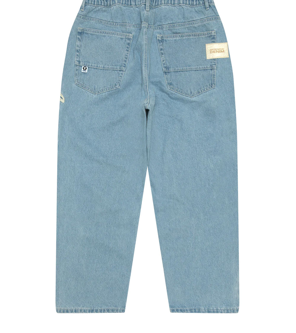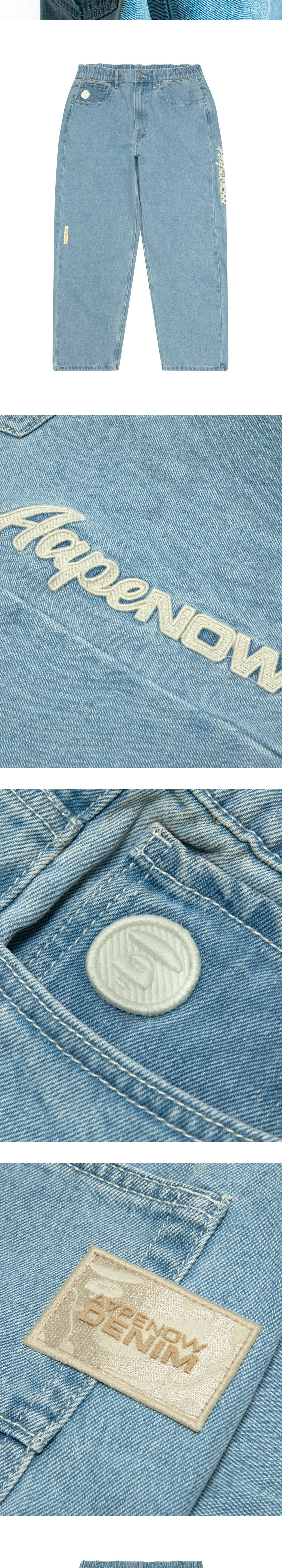 뒷주머니에 부착된 AAPE NOW DENIM 와펜 포인트가 매력적인 에이프의 나우 진 라이트 블루입니다. - 와이드한 실루엣 - 드로 코드로 조절 가능한 허리