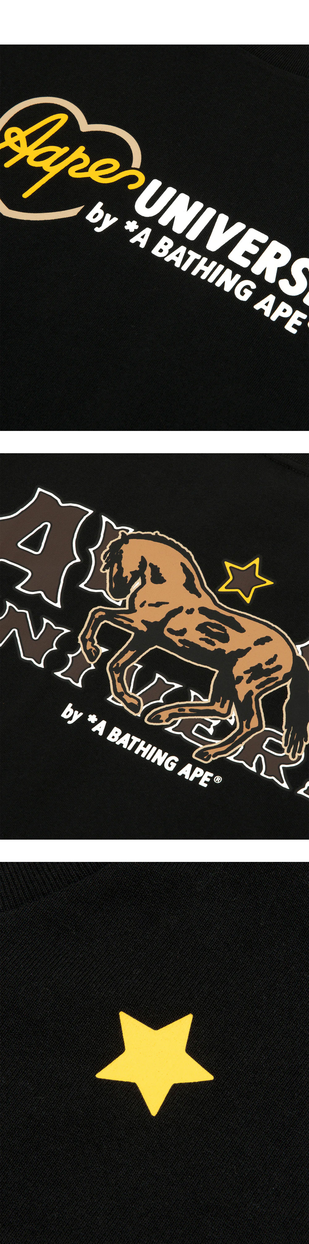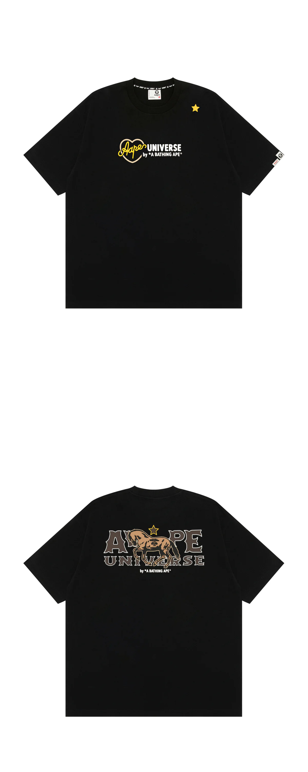 앞면과 뒷면의 아이코닉한 프린팅이 매력적인 에이프의 유니버스 로고 숏 슬리브 티 블랙입니다. - 전/후면 그래픽 프린팅 - 박시한 핏 - 100% 코튼 소재 - 크루 넥