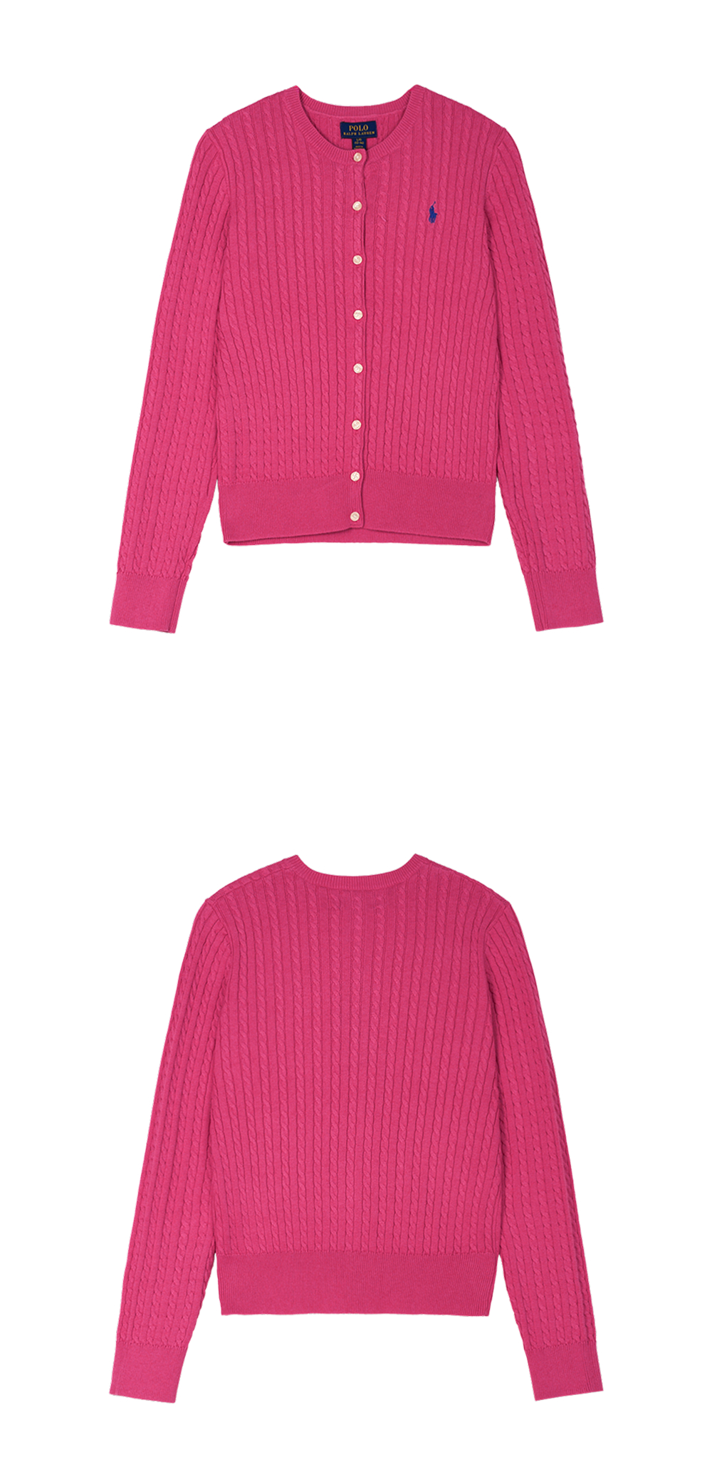 < KREAM은 랄프로렌 코리아 공식 파트너사로 모든 상품은 랄프로렌 코리아(유)에서 공급받은 정식 수입 제품입니다 > 드레스부터 진과 티셔츠까지 어느 아이템과 매치해도 Polo의 시그니처 스타일을 더해주는 폴로 랄프 로렌의 칠드런 미니 케이블 코튼 가디건 핑크 - 25SS입니다. - 크루넥 디자인 - rib-knit cuffs & hem - 버튼 플라켓 - 좌측 가슴에 시그니처 포니 자수