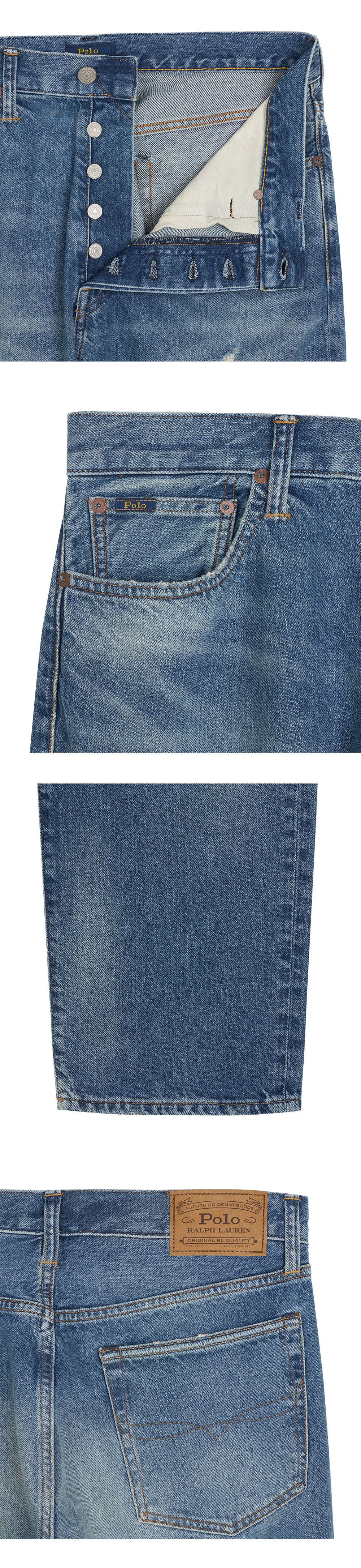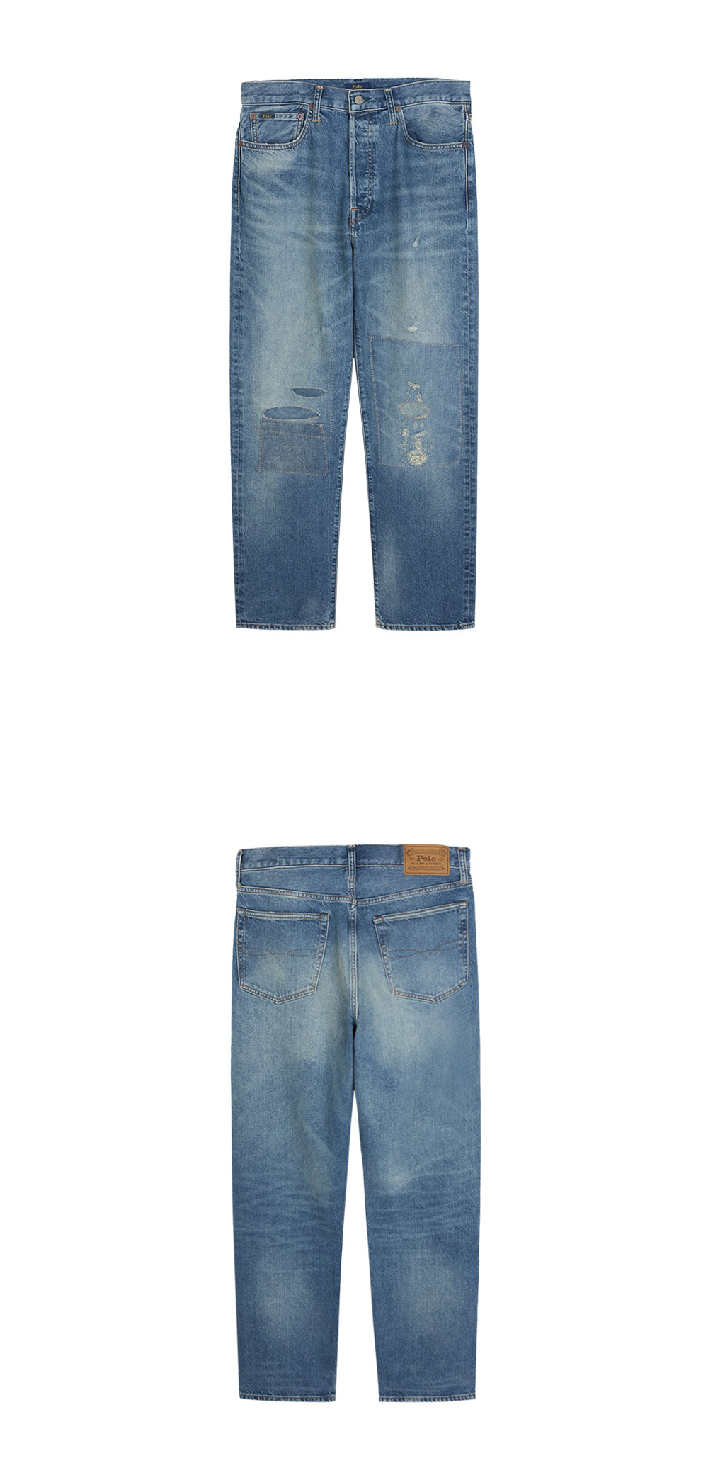 < KREAM은 랄프로렌 코리아 공식 파트너사로 모든 상품은 랄프로렌 코리아(유)에서 공급받은 정식 수입 제품입니다 > 배색 리페어 패치와 핸드샌드 디테일이 정통 빈티지 룩을 선사하는 폴로 랄프 로렌의 헤리티지 스트레이트 디스트레스드 진입니다. - 벨트 루프, 시그니처 버튼 클로저, 버튼 플라이 - 시그니처 메탈 리벳 장식의 5포켓 스타일링, 배색 리페어 패치 - 오른쪽 웨이스트 뒷면에 'Polo Ralph Lauren' 포일 프린트 패치