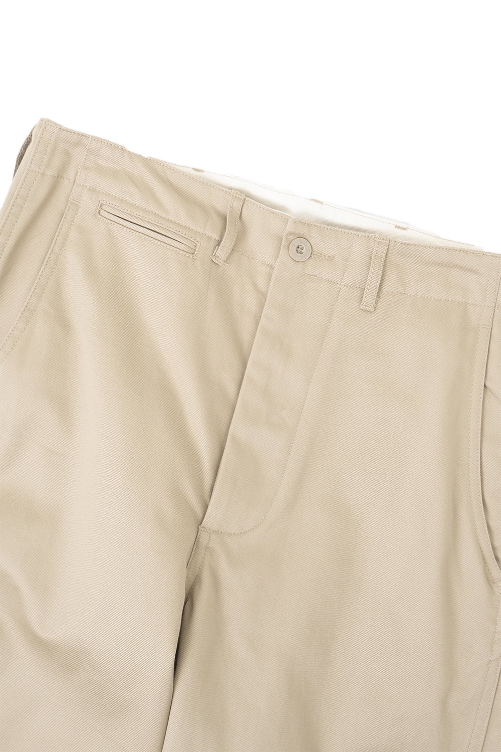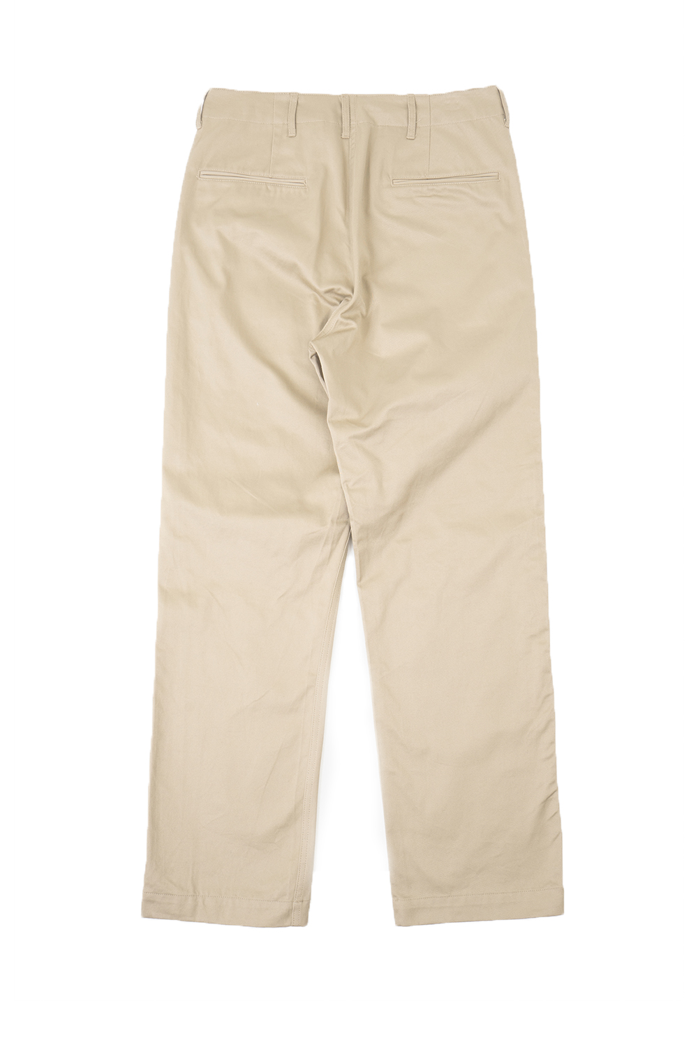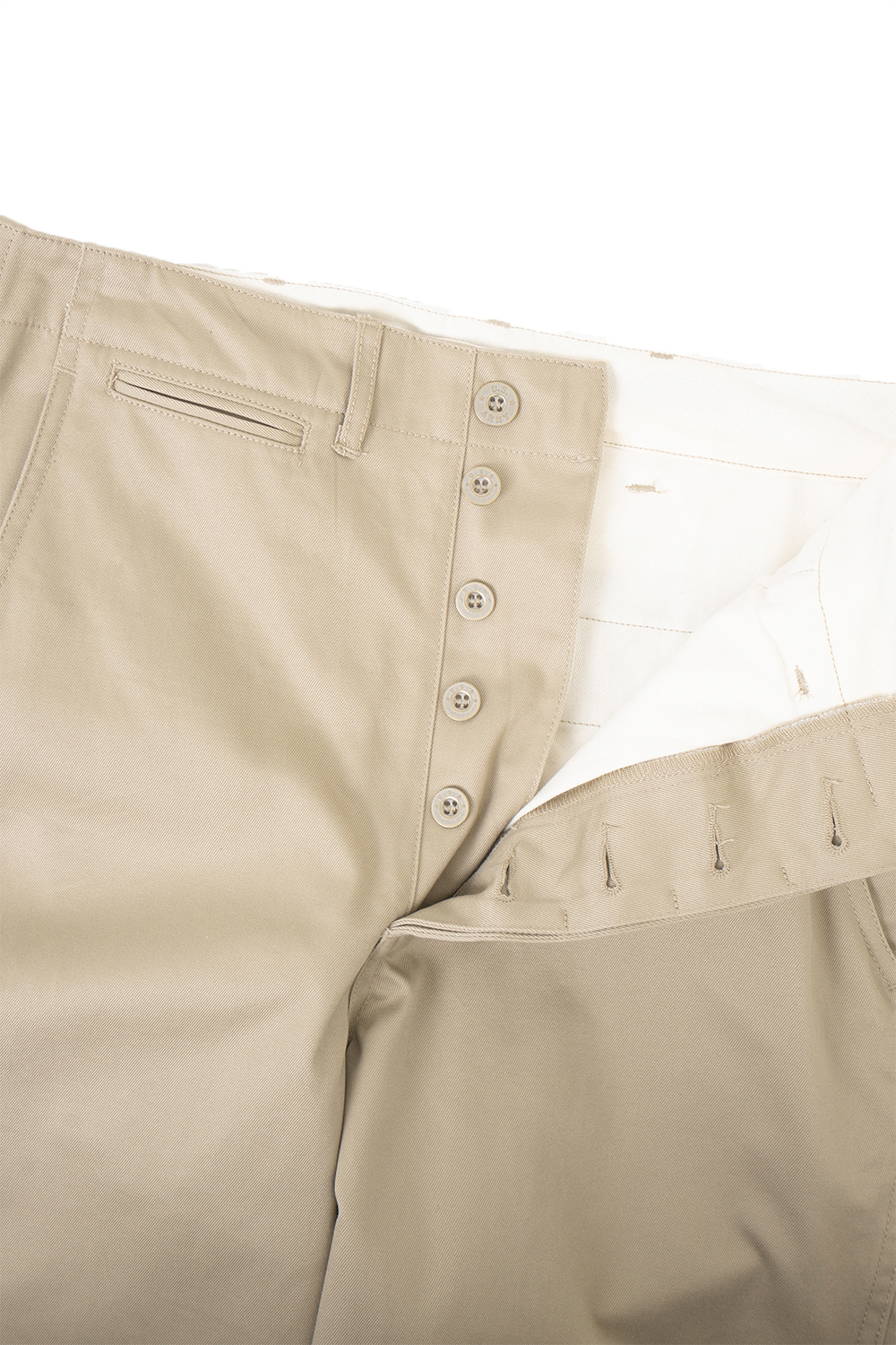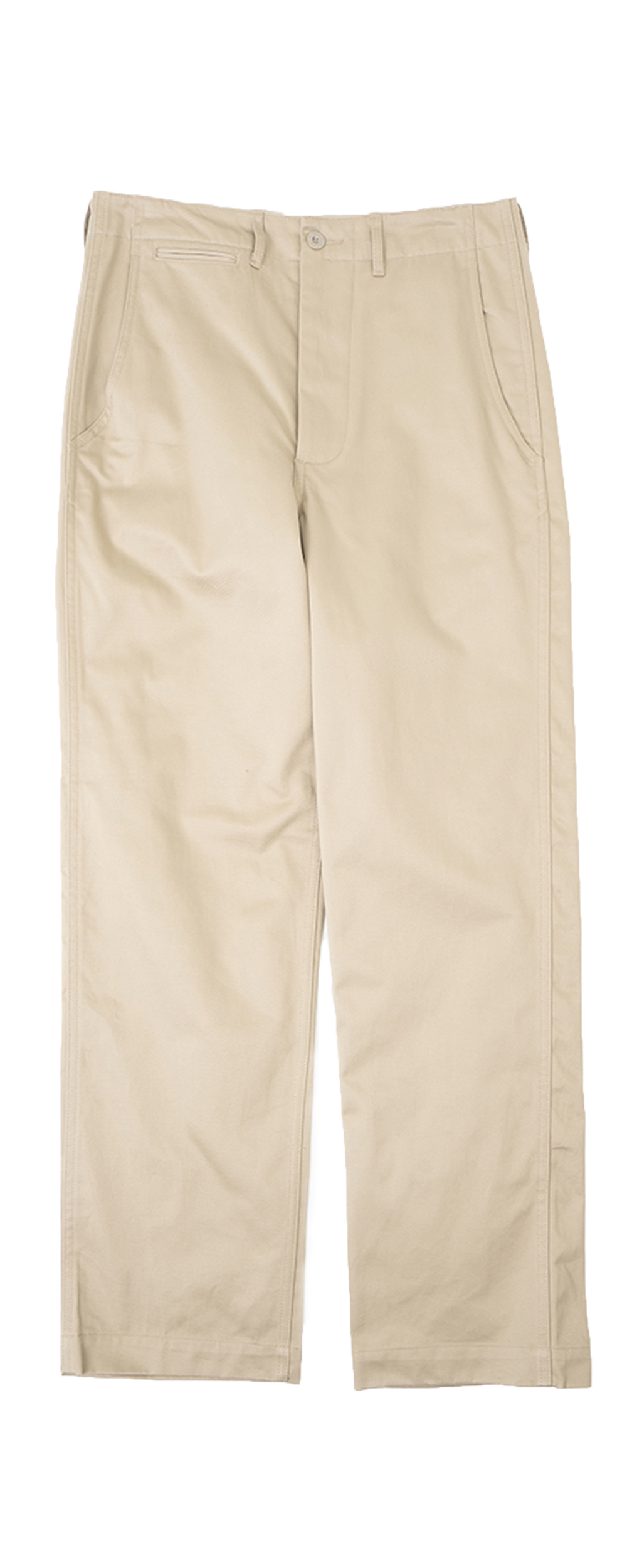 YMCL KY US Type M42 Chino Pants - Khaki 1942년대에 채용된 치노 팬츠를 재현한 제품입니다. 2차 세계대전 이후 물자 절약을 위한 도넛 버튼과 간결한 실루엣이 특징입니다. 프론트에는 코인포켓이 디자인되어 있으며 버튼 플라이가 적용되었습니다. * Cotton * YMCL KY 는 합리적인 가격으로 제품을 제공하기 위하여 별도의 포장이 존재하지 않습니다. * 빛에 의한 제품의 색감 차이가 존재 할 수 있습니다. * Made in China