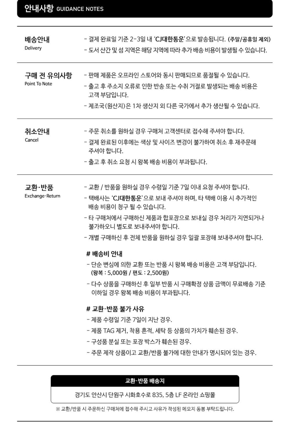 교환 및 반품 안내