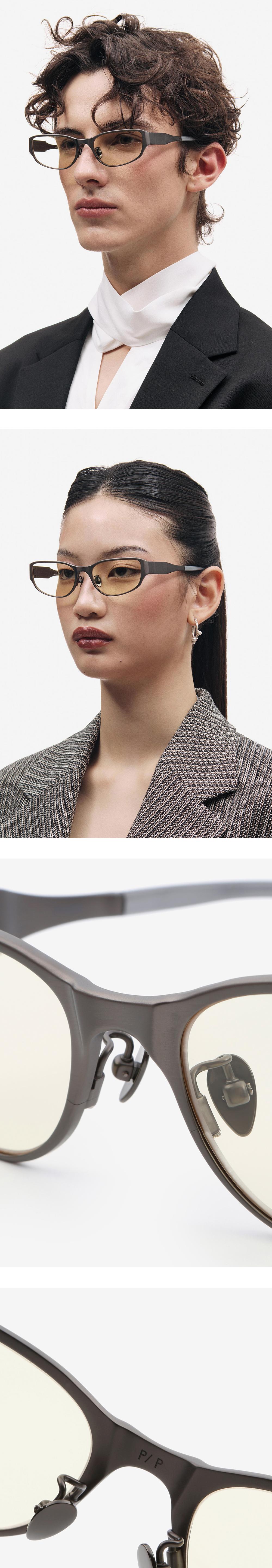 인간다움(Humanity)을 표현하기 위해 공예품과 같이 비정형적 이미지에서 모티브를 얻은 고글형 선글라스. 엔드피스에서 템플까지 균일하지 않은 메탈 컷팅을 하여 비정형의 형태를 표현함으로써 디자인의 개성을 더하였습니다. 코브릿지에도 유연하지 않은 각진 컷팅 디테일을 살려 디자인의 컨셉을 표현하였으며, 브릿지 안쪽에 심볼 로고를 각인하여 브랜드의 정체성을 강화시켰습니다.
