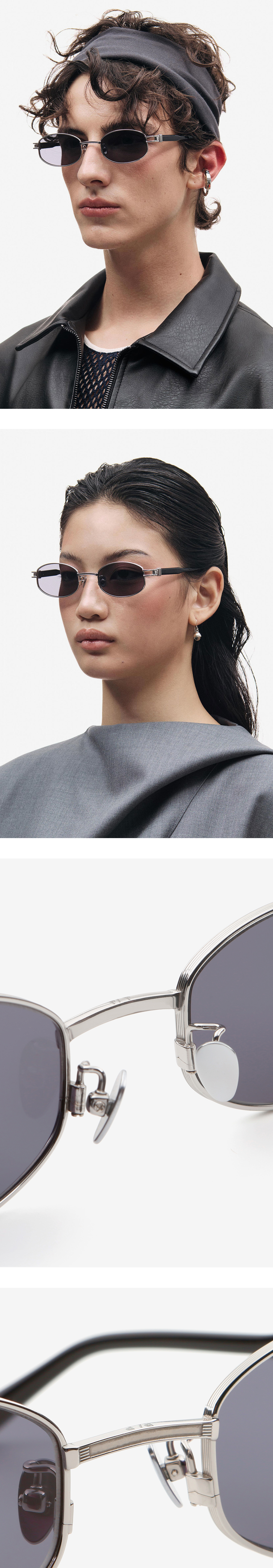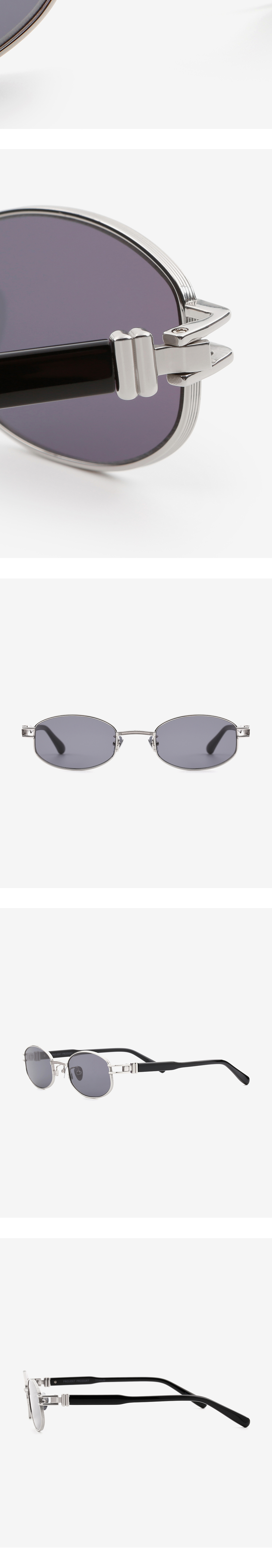 비정형적인 안구 디자인으로 작업된 둥근 직사각형의 티타늄 선글라스. 코브릿지의 음각 패턴이 제품의 고급스러움 강조 시키며, 엔드피스와 다리의 연결 부분에 공예품의 악세사리 요소를 적용하여 자연스러우면서도 개성 있는 디자인을 표현하였습니다.