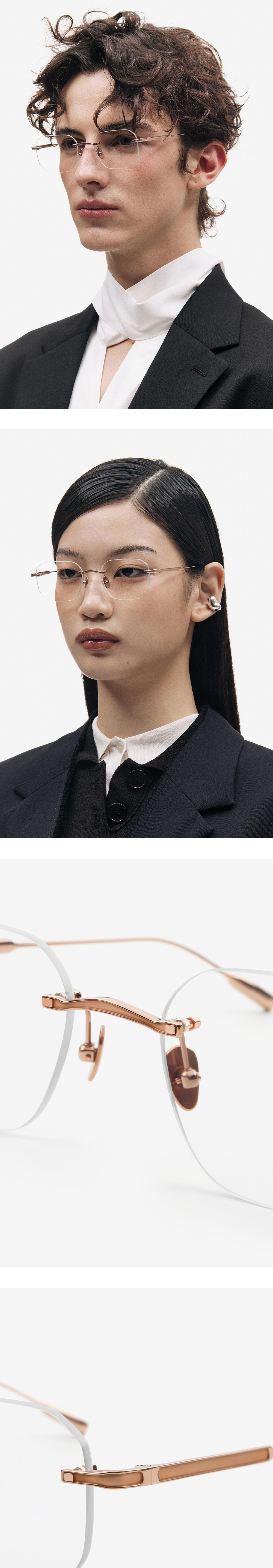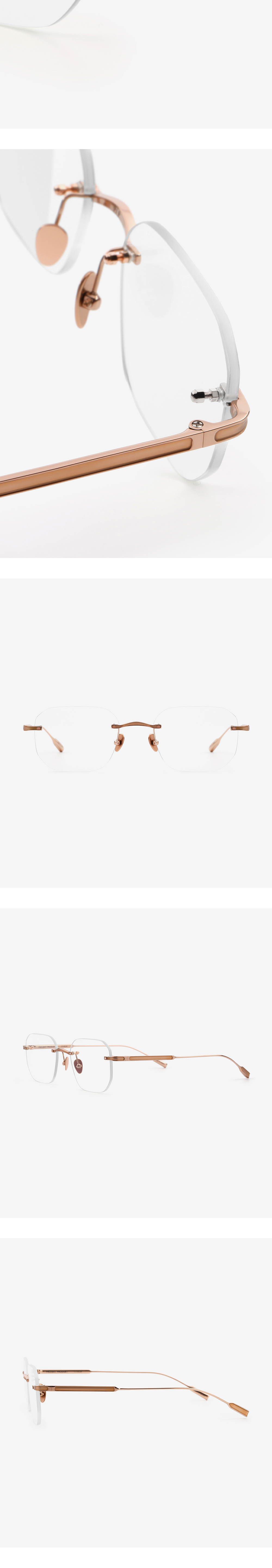 직선과 곡선의 자연스로운 조화로 개성 있는 안구 실루엣을 완성시킨 무테 안경. PROJECT 12 테마인 인간다움(Humanity)을 표현하기 위하여 추상적인 조형 요소를 적용시켜 테마를 표현하였습니다. 메탈이 부분적으로 파져있는 듯한 형태로 디자인을 하여 유니크한 개성을 더하였습니다.