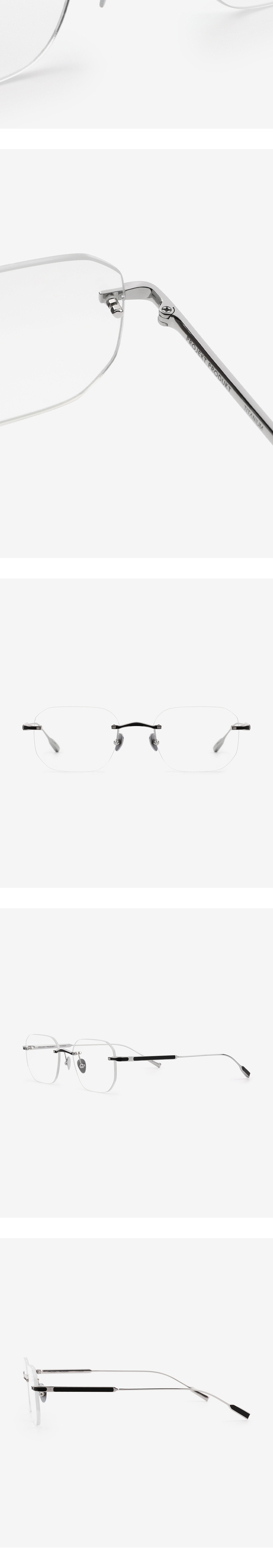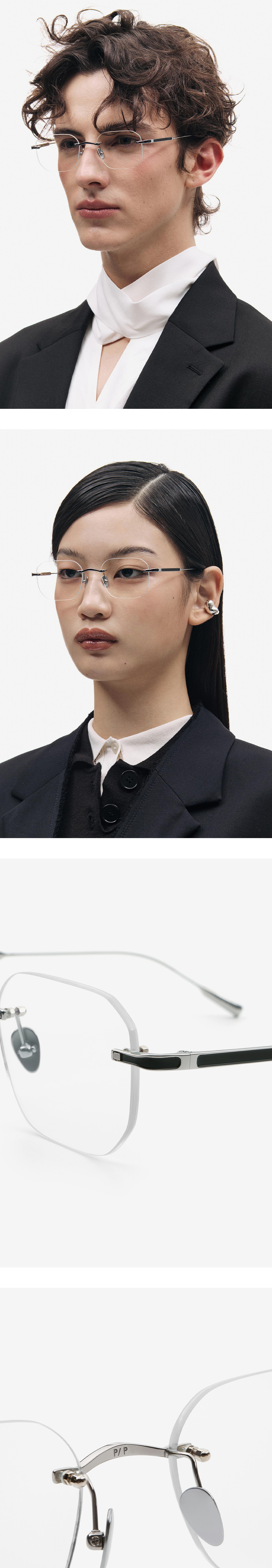 직선과 곡선의 자연스로운 조화로 개성 있는 안구 실루엣을 완성시킨 무테 안경. PROJECT 12 테마인 인간다움(Humanity)을 표현하기 위하여 추상적인 조형 요소를 적용시켜 테마를 표현하였습니다. 메탈이 부분적으로 파져있는 듯한 형태로 디자인을 하여 유니크한 개성을 더하였습니다.