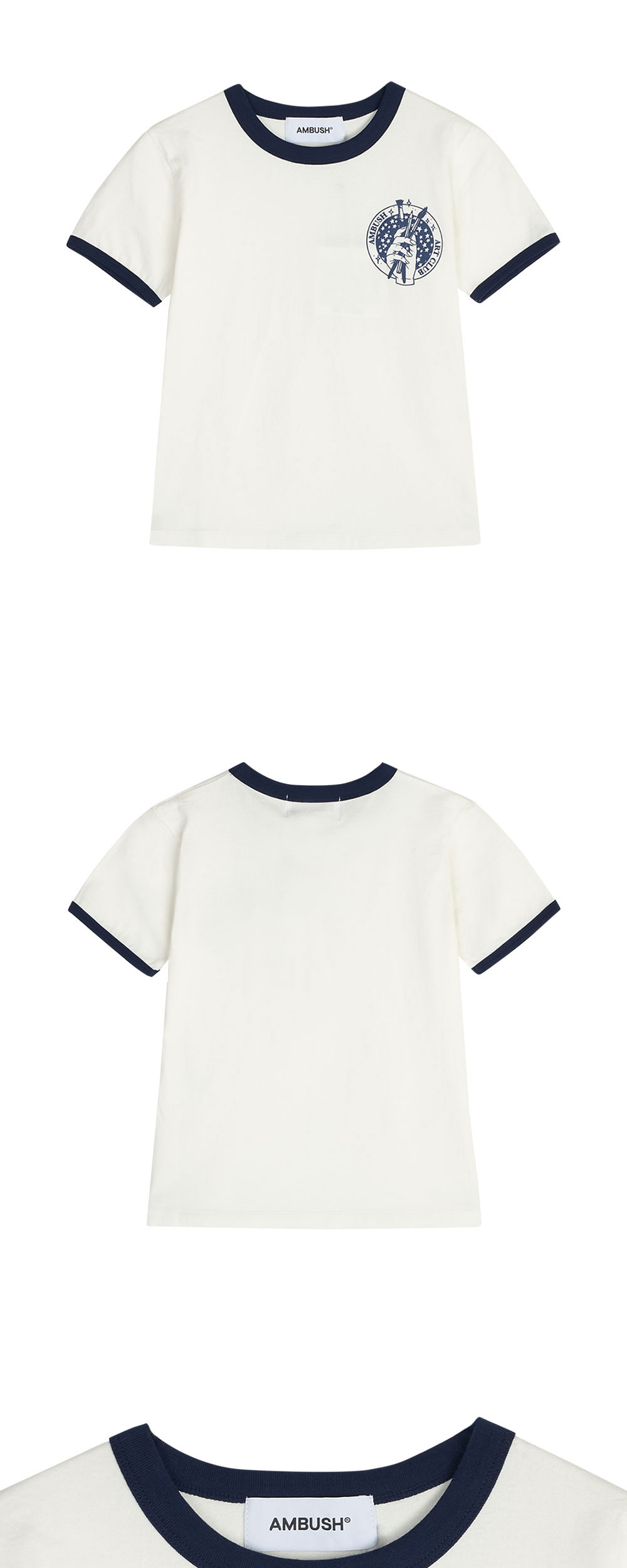 앞면의 작은 프린팅과 깔끔한 디자인이 매력적인 앰부쉬의 우먼 아트 클럽 피티드 티셔츠 화이트입니다. - 링거티 디자인 - 스몰 프린팅